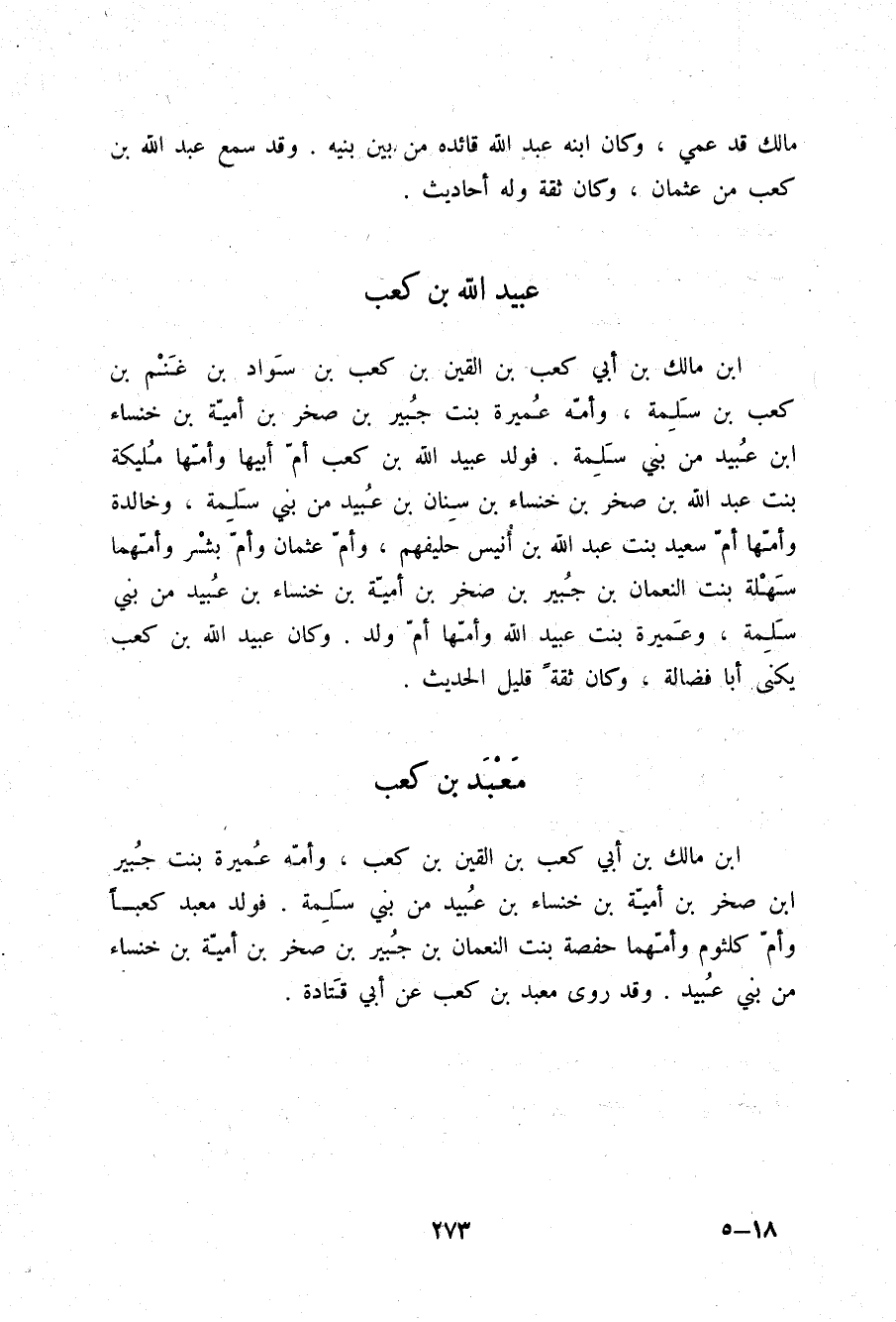 §مَعْبَدُ بْنُ كَعْبِ بْنِ مَالِكِ بْنِ أَبِي كَعْبِ بْنِ الْقَيْنِ بْنِ كَعْبٍ وَأُمُّهُ عَمِيرَةُ بِنْتُ جُبَيْرِ بْنِ صَخْرِ بْنِ أُمَيَّةَ بْنِ خَنْسَاءَ بْنِ عُبَيْدٍ مِنْ بَنِي سَلِمَةَ , فَوَلَدَ مَعْبَدٌ كَعْبًا وَأُمَّ كُلْثُومٍ وَأُمُّهُمَا حَفْصَةُ بِنْتُ النُّعْمَانِ بْنِ جُبَيْرِ بْنِ صَخْرِ بْنِ أُمَيَّةَ بْنِ خَنْسَاءَ مِنْ بَنِي عُبَيْدٍ , وَقَدْ رَوَى مَعْبَدُ بْنُ كَعْبٍ عَنْ أَبِي قَتَادَةَ -[274]- عَبْدِ الرَّحْمَنِ بْنِ كَعْبِ بْنِ مَالِكِ بْنِ أَبِي كَعْبِ بْنِ الْقَيْنِ بْنِ كَعْبٍ وَأُمُّهُ أُمُّ وَلَدٍ , فَوَلَدَ عَبْدُ الرَّحْمَنِ بَشِيرًا , وَكَعْبًا , وَمُحَمَّدًا , وَحُمَيْدَةَ وَأُمُّهُمْ أُمُّ الْبَنِينَ بِنْتُ أَبِي قَتَادَةَ بْنِ رِبْعِيٍّ مِنْ بَنِي سَلِمَةَ , وَأُمَّ الْفَضْلِ وَأُمُّهَا أُمُّ سَعِيدٍ بِنْتُ عَبْدِ اللَّهِ بْنِ أُنَيْسٍ حَلِيفِ بَنِي سَلِمَةَ , وَكَانَ يُكْنَى أَبَا الْخَطَّابِ , وَكَانَ ثِقَةً وَهُوَ أَكْثَرُ حَدِيثًا مِنْ أَخِيهِ , وَتُوُفِّيَ فِي خِلَافَةِ سُلَيْمَانَ بْنِ عَبْدِ الْمَلِكِ
