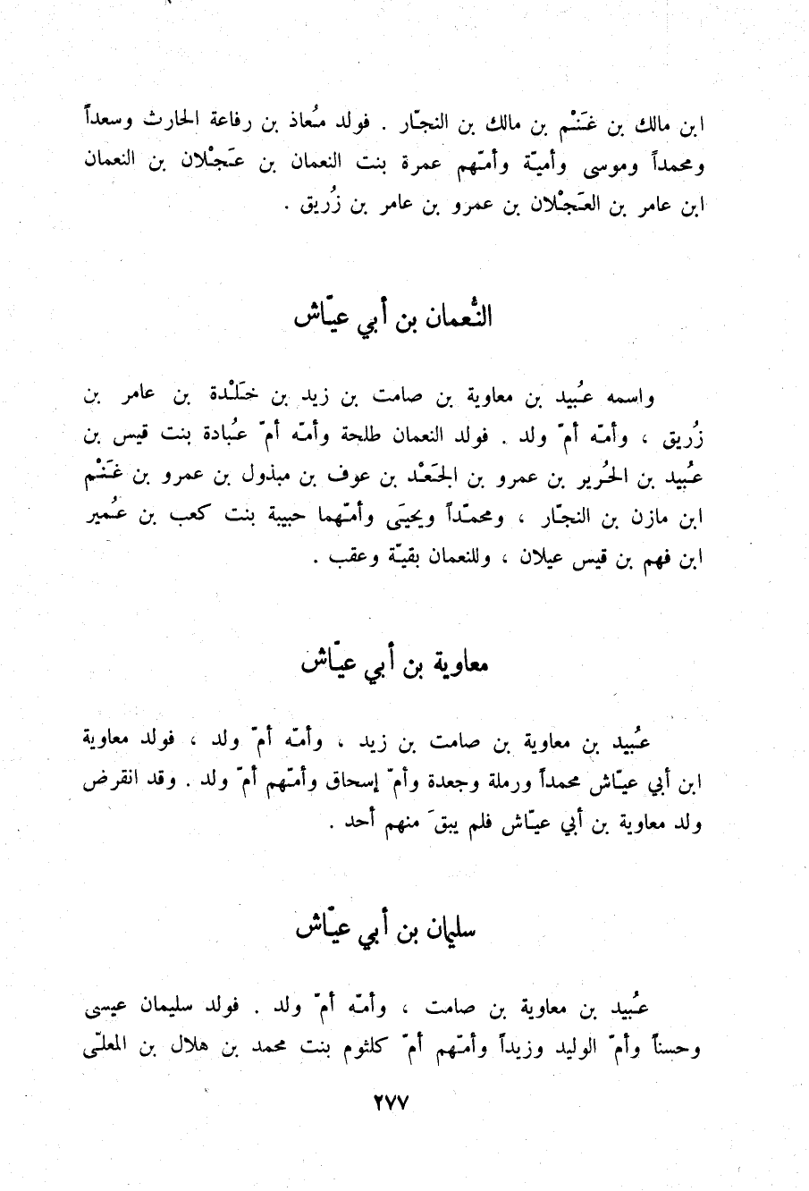 §النُّعْمَانُ بْنُ أَبِي عَيَّاشٍ وَاسْمُهُ عُبَيْدُ بْنُ مُعَاوِيَةَ بْنِ صَامِتِ بْنِ زَيْدِ بْنِ خَلْدَةَ بْنِ عَامِرِ بْنِ زُرَيْقٍ , وَأُمُّهُ أُمُّ وَلَدٍ , فَوَلَدَ النُّعْمَانُ طَلْحَةَ وَأُمُّهُ أُمُّ عُبَادَةَ بِنْتُ قَيْسِ بْنِ عُبَيْدِ بْنِ الْحَرِيرِ بْنِ عَمْرِو بْنِ الْجَعْدِ بْنِ عَوْفِ بْنِ مَبْذُولِ بْنِ عَمْرِو بْنِ غَنْمِ بْنِ مَازِنِ بْنِ النَّجَّارِ , وَمُحَمَّدًا وَيَحْيَى وَأُمُّهُمَا حَبِيبَةُ بِنْتُ كَعْبِ بْنِ عُمَيْرِ بْنِ فَهْمِ بْنِ قَيْسِ عَيْلَانَ , وَلِلنُّعْمَانِ بَقِيَّةٌ وَعَقِبٌ