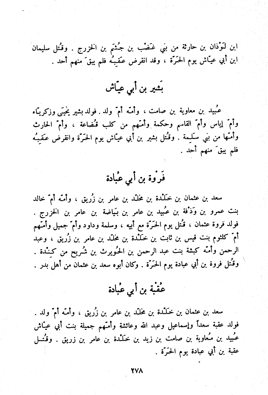 §فَرْوَةُ بْنُ أَبِي عُبَادَةَ سَعْدِ بْنِ عُثْمَانَ بْنِ خَلْدَةَ بْنِ مَخْلَدِ بْنِ عَامِرِ بْنِ زُرَيْقٍ وَأُمُّهُ أُمُّ خَالِدٍ بِنْتُ عَمْرِو بْنِ وَذْفَةَ بْنِ عُبَيْدِ بْنِ عَامِرِ بْنِ بَيَاضَةَ بْنِ عَامِرِ بْنِ الْخَزْرَجِ , فَوَلَدَ فَرْوَةُ عُثْمَانَ قُتِلَ يَوْمَ الْحَرَّةِ مَعَ أَبِيهِ , وَسَلَمَةَ , وَدَاوُدَ , وَأُمَّ جَمِيلٍ وَأُمُّهُمْ أُمُّ كُلْثُومٍ بِنْتُ قَيْسِ بْنِ ثَابِتِ بْنِ خَلْدَةَ بْنِ مَخْلَدِ بْنِ عَامِرِ بْنِ زُرَيْقٍ , وَعَبْدَ الرَّحْمَنِ وَأُمُّهُ كَبْشَةُ بِنْتُ عَبْدِ الرَّحْمَنِ بْنِ الْحُوَيْرِثِ بْنِ شُرَيْحٍ مِنْ كِنْدَةَ , وَقُتِلَ فَرْوَةُ بْنُ أَبِي عُبَادَةَ يَوْمَ الْحَرَّةِ , وَكَانَ أَبُوهُ سَعْدُ بْنُ عُثْمَانَ مِنْ أَهْلِ بَدْرٍ