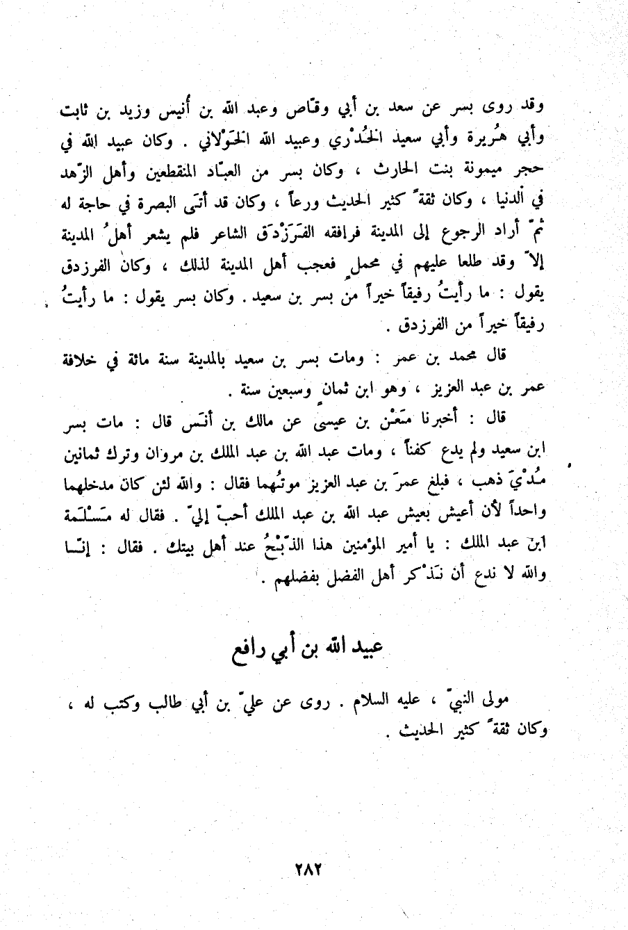 §عُبَيْدُ اللَّهِ بْنُ أَبِي رَافِعٍ مَوْلَى النَّبِيِّ عَلَيْهِ السَّلَامُ. رَوَى عَنْ عَلِيِّ بْنِ أَبِي طَالِبٍ , وَكَتَبَ لَهُ وَكَانَ ثِقَةً كَثِيرَ الْحَدِيثِ