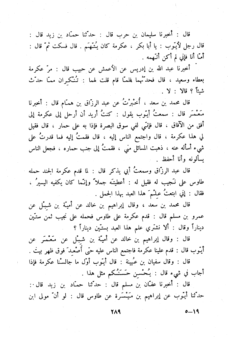 قَالَ أَخْبَرَنَا سُلَيْمَانُ بْنُ حَرْبٍ قَالَ: حَدَّثَنَا حَمَّادُ بْنُ زَيْدٍ قَالَ: قَالَ رَجُلٌ لِأَيُّوبَ: يَا أَبَا بَكْرٍ , عِكْرِمَةُ كَانَ يُتَّهَمُ. قَالَ: فَسَكَتَ , ثُمَّ قَالَ: §أَمَّا أَنَا فَإِنِّي لَمْ أَكُنْ أَتَّهِمُهُ "
