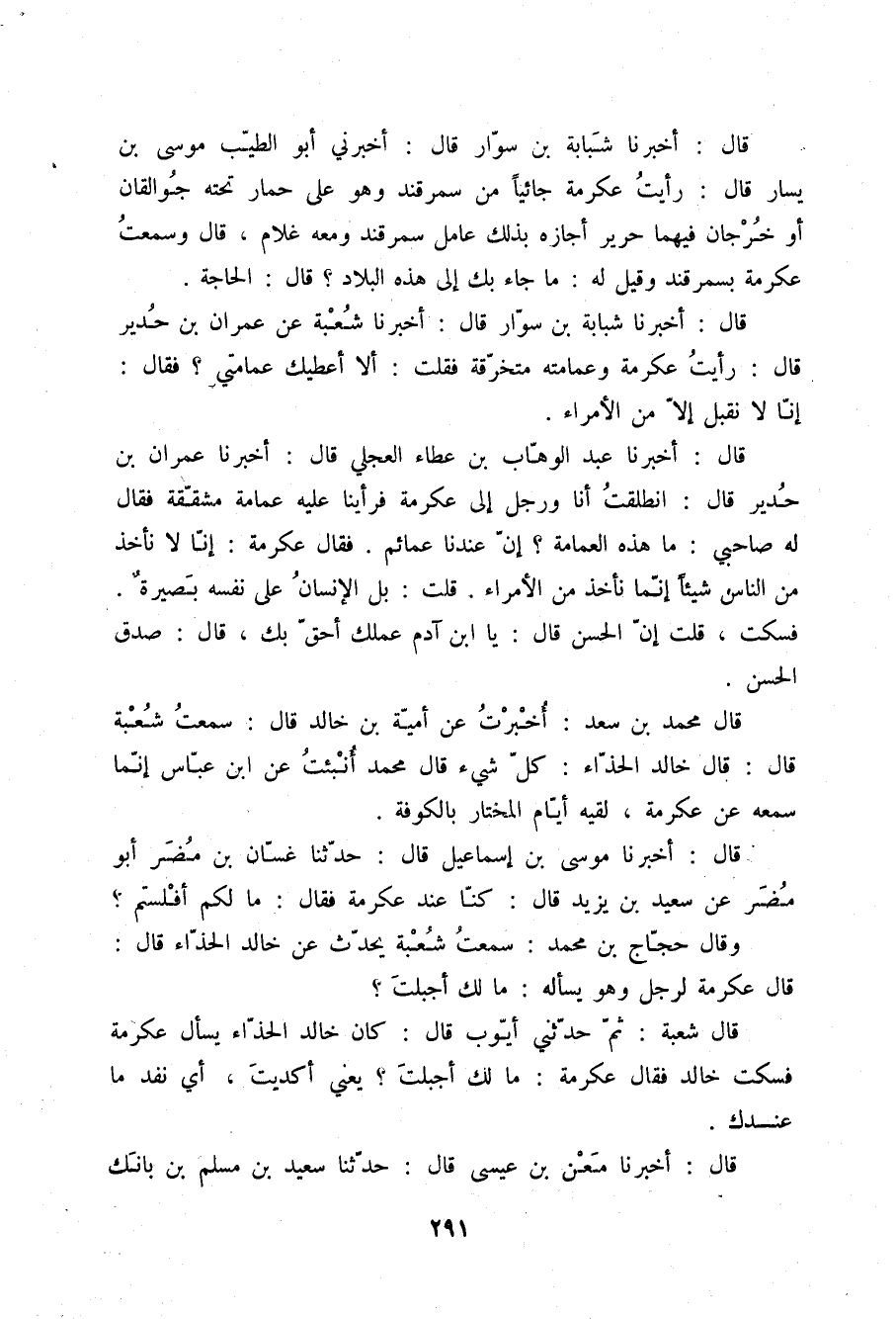 قَالَ أَخْبَرَنَا شَبَابَةُ بْنُ سَوَّارٍ قَالَ: أَخْبَرَنَا شُعْبَةُ , عَنْ عِمْرَانَ بْنِ حُدَيْرٍ قَالَ: رَأَيْتُ عِكْرِمَةَ وَعِمَامَتُهُ مُتَخَرِّقَةٌ , فَقُلْتُ: §أَلَا أُعْطِيكَ عِمَامَتِي؟ فَقَالَ: إِنَّا لَا نَقْبَلُ إِلَّا مِنَ الْأُمَرَاءِ "