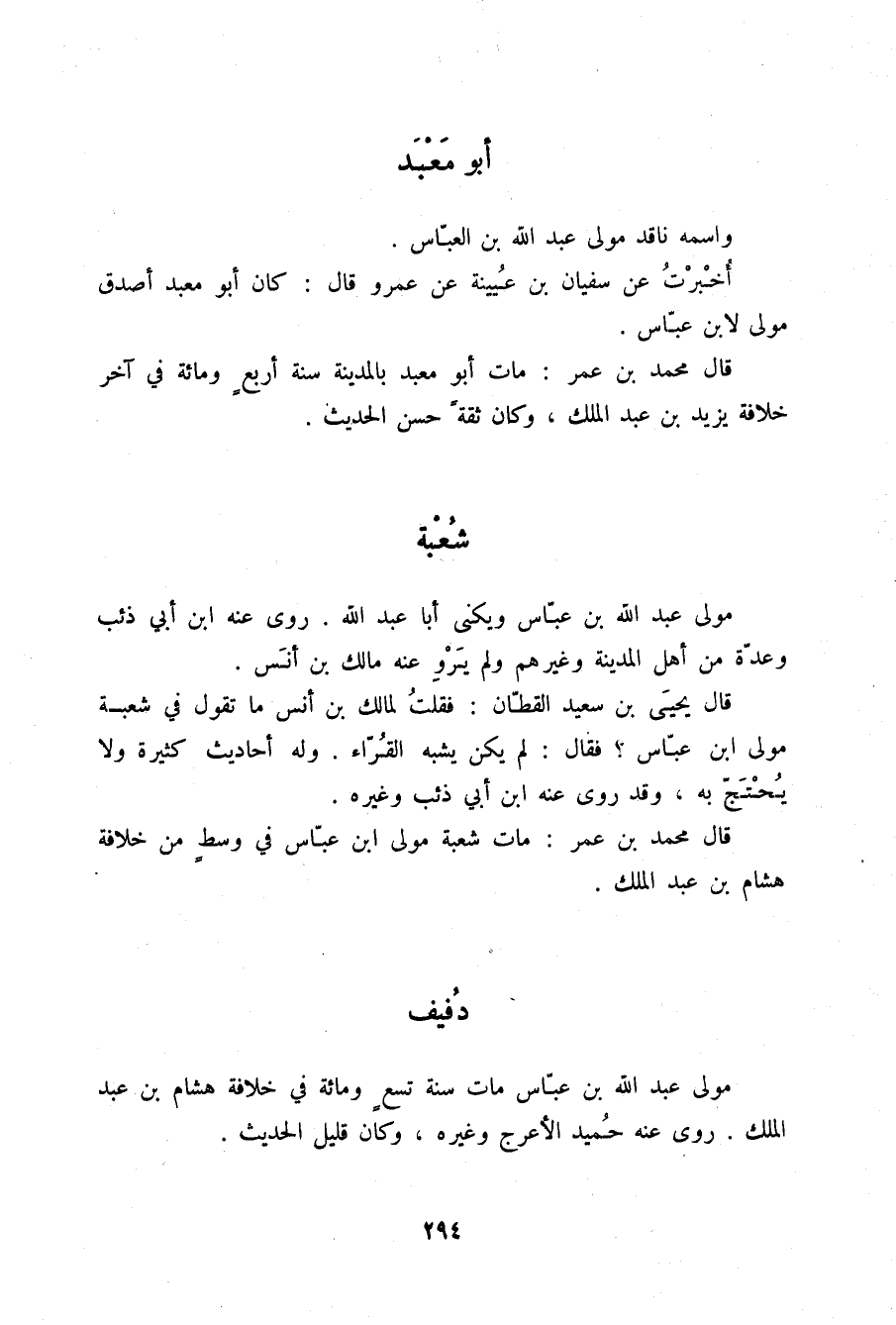 §شُعْبَةُ مَوْلَى عَبْدِ اللَّهِ بْنِ عَبَّاسٍ , وَيُكَنَّى أَبَا عَبْدِ اللَّهِ. رَوَى عَنْهُ ابْنُ أَبِي ذِئْبٍ وَعِدَّةٌ مِنْ أَهْلِ الْمَدِينَةِ وَغَيْرِهِمْ , وَلَمْ يَرْوِ عَنْهُ مَالِكُ بْنُ أَنَسٍ قَالَ يَحْيَى بْنُ سَعِيدٍ الْقَطَّانُ: فَقُلْتُ لِمَالِكِ بْنِ أَنَسٍ: مَا تَقُولُ فِي شُعْبَةَ مَوْلَى ابْنِ عَبَّاسٍ؟ فَقَالَ: لَمْ يَكُنْ يُشْبِهُ الْقُرَّاءَ , وَلَهُ أَحَادِيثُ كَثِيرَةٌ , وَلَا يُحْتَجُّ بِهِ , وَقَدْ رَوَى عَنْهُ ابْنُ أَبِي ذِئْبٍ وَغَيْرُهُ. قَالَ مُحَمَّدُ بْنُ عُمَرَ: مَاتَ شُعْبَةُ مَوْلَى ابْنِ عَبَّاسٍ فِي وَسَطٍ مِنْ خِلَافَةِ هِشَامِ بْنِ عَبْدِ الْمَلِكِ