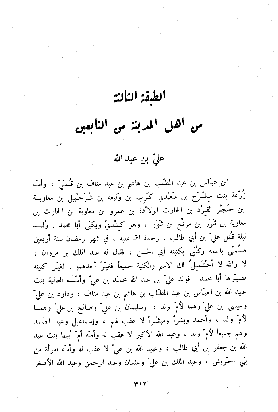 §عَلِيُّ بْنُ عَبْدِ اللَّهِ بْنِ عَبَّاسِ بْنِ عَبْدِ الْمُطَّلِبِ بْنِ هَاشِمِ بْنِ عَبْدِ مَنَافِ بْنِ قُصَيٍّ , وَأُمُّهُ زُرْعَةُ بِنْتُ مِشْرَحِ بْنِ مَعْدِي كَرِبَ بْنِ وَلِيعَةَ بْنِ شُرَحْبِيلَ بْنِ مُعَاوِيَةَ بْنِ حُجْرٍ الْقَرِدِ ابْنِ الْحَارِثِ الْوِلَادَةِ ابْنِ عَمْرِو بْنِ مُعَاوِيَةَ بْنِ الْحَارِثِ بْنِ مُعَاوِيَةَ بْنِ ثَوْرِ بْنِ مُرَتَّعِ بْنِ ثَوْرٍ وَهُوَ كِنْدِيٌّ , وَيُكَنَّى أَبَا مُحَمَّدٍ. وُلِدَ لَيْلَةَ قُتِلَ عَلِيُّ بْنُ أَبِي طَالِبٍ رَحْمَةُ اللَّهِ عَلَيْهِ فِي شَهْرِ رَمَضَانَ سَنَةَ أَرْبَعِينَ , فَسُمِّيَ بِاسْمِهِ , وَكُنِيَ بِكُنْيَتِهِ أَبِي الْحَسَنِ , فَقَالَ لَهُ عَبْدُ الْمَلِكِ بْنُ مَرْوَانَ: لَا وَاللَّهِ , لَا احْتَمِلُ لَكَ الِاسْمَ وَالْكُنْيَةَ جَمِيعًا؛ فَغَيِّرْ أَحَدَهُمَا , فَغَيَّرَ كُنْيَتَهُ , فَصَيَّرَهَا أَبَا مُحَمَّدٍ فَوَلَدَ عَلِيُّ بْنُ عَبْدِ اللَّهِ مُحَمَّدَ بْنَ عَلِيٍّ وَأُمُّهُ الْعَالِيَةُ بِنْتُ عُبَيْدِ اللَّهِ بْنِ الْعَبَّاسِ بْنِ عَبْدِ الْمُطَّلِبِ بْنِ هَاشِمِ بْنِ عَبْدِ مَنَافٍ , وَدَاوُدَ بْنَ عَلِيٍّ وَعِيسَى بْنَ عَلِيٍّ وَهُمَا لِأُمِّ وَلَدٍ , وَسُلَيْمَانَ بْنَ عَلِيٍّ وَصَالِحَ بْنَ عَلِيٍّ وَهُمَا لِأُمِّ وَلَدٍ , وَأَحْمَدَ , وَبِشْرًا وَمُبَشِّرًا لَا عَقِبَ لَهُمْ , وَإِسْمَاعِيلَ , وَعَبْدَ الصَّمَدِ وَهُمْ جَمِيعًا لِأُمِّ وَلَدٍ , وَعَبْدَ اللَّهِ الْأَكْبَرَ لَا عَقِبَ لَهُ وَأُمُّهُ أُمُّ أَبِيهَا بِنْتُ عَبْدِ اللَّهِ بْنِ جَعْفَرِ بْنِ أَبِي طَالِبٍ , وَعُبَيْدَ اللَّهِ بْنَ عَلِيٍّ لَا عَقِبَ لَهُ وَأُمُّهُ امْرَأَةٌ مِنْ بَنِي الْحَرِيشِ , وَعَبْدَ الْمَلِكِ بْنَ عَلِيٍّ , وَعُثْمَانَ , وَعَبْدَ الرَّحْمَنِ , وَعَبْدَ اللَّهِ الْأَصْغَرَ