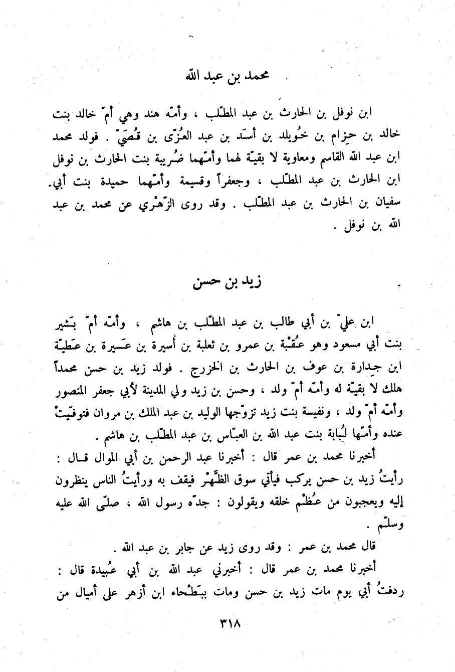 §زَيْدُ بْنُ حَسَنِ بْنِ عَلِيِّ بْنِ أَبِي طَالِبِ بْنِ عَبْدِ الْمُطَّلِبِ بْنِ هَاشِمٍ وَأُمُّهُ أُمُّ بَشِيرٍ بِنْتُ أَبِي مَسْعُودٍ وَهُوَ عُقْبَةُ بْنُ عَمْرِو بْنِ ثَعْلَبَةَ بْنِ أُسَيْرَةَ بْنِ عَسِيرَةَ بْنِ عَطِيَّةَ بْنِ جِدَارَةَ بْنِ عَوْفِ بْنِ الْحَارِثِ بْنِ الْخَزْرَجِ , فَوَلَدَ زَيْدُ بْنُ حَسَنٍ مُحَمَّدًا هَلَكَ لَا بَقِيَّةَ لَهُ وَأُمُّهُ أُمُّ وَلَدٍ , وَحَسَنَ بْنَ زَيْدٍ وَلِيَ الْمَدِينَةَ لِأَبِي جَعْفَرٍ الْمَنْصُورِ وَأُمُّهُ أُمُّ وَلَدٍ , وَنَفِيسَةَ بِنْتَ زَيْدٍ تَزَوَّجَهَا الْوَلِيدُ بْنُ عَبْدِ الْمَلِكِ بْنِ مَرْوَانَ فَتُوُفِّيَتْ عِنْدَهُ وَأُمُّهَا لُبَابَةُ بِنْتُ عَبْدِ اللَّهِ بْنِ الْعَبَّاسِ بْنِ عَبْدِ الْمُطَّلِبِ بْنِ هَاشِمٍ