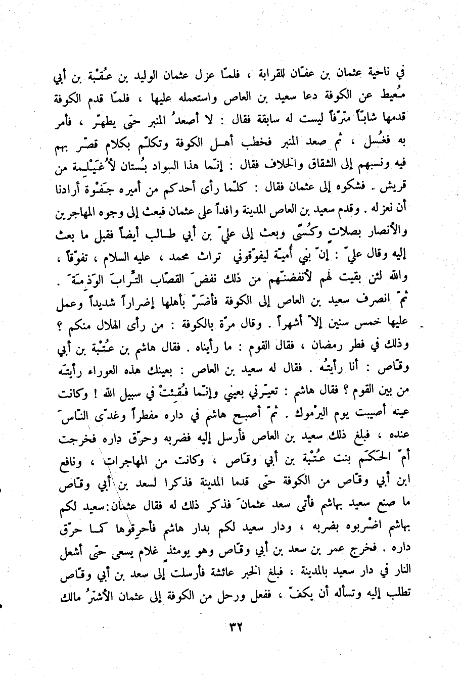 فِي نَاحِيَةِ عُثْمَانَ بْنِ عَفَّانَ لِلْقَرَابَةِ فَلَمَّا عَزَلَ عُثْمَانُ الْوَلِيدَ بْنَ عُقْبَةَ بْنِ أَبِي مُعَيْطٍ عَنِ الْكُوفَةِ دَعَا سَعِيدَ بْنَ الْعَاصِ , وَاسْتَعْمَلَهُ عَلَيْهَا , فَلَمَّا قَدِمَ الْكُوفَةَ قَدِمَهَا شَابًّا مُتْرَفًا لَيْسَتْ لَهُ سَابِقَةٌ , فَقَالَ: لَا أَصْعَدُ الْمِنْبَرَ حَتَّى يُطَهَّرَ , فَأَمَرَ بِهِ فَغُسِلَ , ثُمَّ صَعِدَ الْمِنْبَرَ , فَخَطَبَ أَهْلَ الْكُوفَةِ , وَتَكَلَّمَ بِكَلَامٍ قَصَّرَ بِهِمْ فِيهِ , وَنَسَبَهُمْ إِلَى الشِّقَاقِ وَالْخِلَافِ , فَقَالَ: إِنَّمَا هَذَا السَّوَادُ بُسْتَانٌ لِأُغَيْلِمَةٍ مِنْ قُرَيْشٍ , فَشَكَوْهُ إِلَى عُثْمَانَ , فَقَالَ: كُلَّمَا رَأَى أَحَدُكُمْ مِنْ أَمِيرِهِ جَفْوَةً أَرَادَنَا أَنْ نَعْزِلَهُ , وَقَدِمَ سَعِيدُ بْنُ الْعَاصِ الْمَدِينَةَ وَافِدًا عَلَى عُثْمَانَ , فَبَعَثَ إِلَى وُجُوهِ الْمُهَاجِرِينَ وَالْأَنْصَارِ بِصِلَاتٍ وَكُسًى , وَبَعَثَ إِلَى عَلِيِّ بْنِ أَبِي طَالِبٍ أَيْضًا , فَقَبِلَ مَا بَعَثَ إِلَيْهِ , وَقَالَ عَلِيٌّ: " إِنَّ بَنِي أُمَيَّةَ لَيُفَوِّقُونِي تُرَاثَ مُحَمَّدٍ عَلَيْهِ السَّلَامُ تَفَوُّقًا , وَاللَّهِ لَئِنْ بَقِيتُ لَهُمْ لَأَنْفُضَنَّهُمْ مِنْ ذَلِكَ نَفْضَ الْقَصَّابِ التُّرَابَ الْوَذِمَةَ , ثُمَّ انْصَرَفَ سَعِيدُ بْنُ الْعَاصِ إِلَى الْكُوفَةِ , فَأَضَرَّ بِأَهْلِهَا إِضْرَارًا شَدِيدًا , وَعَمِلَ عَلَيْهَا خَمْسَ سِنِينَ إِلَّا أَشْهُرًا , وَقَالَ مَرَّةً بِالْكُوفَةِ: مَنْ رَأَى الْهِلَالَ مِنْكُمْ , وَذَلِكَ فِي فِطْرِ رَمَضَانَ؟ فَقَالَ الْقَوْمُ: مَا رَأَيْنَاهُ , فَقَالَ هَاشِمُ بْنُ عُتْبَةَ بْنِ أَبِي وَقَّاصٍ: أَنَا رَأَيْتُهُ , فَقَالَ لَهُ سَعِيدُ بْنُ الْعَاصِ: بِعَيْنِكَ هَذِهِ الْعَوْرَاءِ رَأَيْتَهُ مِنْ بَيْنِ الْقَوْمِ؟ فَقَالَ هَاشِمٌ: تُعَيِّرُنِي بِعَيْنِي , وَإِنَّمَا فُقِئَتْ فِي سَبِيلِ اللَّهِ، وَكَانَتْ عَيْنُهُ أُصِيبَتْ يَوْمَ الْيَرْمُوكِ , ثُمَّ أَصْبَحَ هَاشِمٌ فِي دَارِهِ مُفْطِرًا وَغَدَّى النَّاسَ عِنْدَهُ , فَبَلَغَ ذَلِكَ سَعِيدَ بْنَ الْعَاصِ , فَأَرْسَلَ إِلَيْهِ فَضَرَبَهُ , وَحَرَّقَ دَارَهُ , فَخَرَجَتْ أُمُّ الْحَكَمِ بِنْتُ عُتْبَةَ بْنِ أَبِي وَقَّاصٍ , وَكَانَتْ مِنَ الْمُهَاجِرَاتِ , وَنَافِعُ بْنُ أَبِي وَقَّاصٍ مِنَ الْكُوفَةِ حَتَّى قَدِمَا الْمَدِينَةَ , فَذَكَرَا لِسَعْدِ بْنِ أَبِي وَقَّاصٍ مَا صَنَعَ سَعِيدٌ بِهَاشِمٍ , فَأَتَى سَعْدٌ عُثْمَانَ , فَذَكَرَ ذَلِكَ لَهُ فَقَالَ عُثْمَانُ: سَعِيدٌ لَكُمْ بِهَاشِمٍ اضْرِبُوهُ بِضَرْبِهِ , وَدَارُ سَعِيدٍ لَكُمْ بِدَارِ هَاشِمٍ فَأَحْرِقُوهَا كَمَا حَرَّقَ دَارَهَ , فَخَرَجَ عُمَرُ بْنُ سَعْدِ بْنِ أَبِي وَقَّاصٍ وَهُوَ يَوْمَئِذٍ غُلَامٌ يَسْعَى حَتَّى أَشْعَلَ النَّارَ فِي دَارِ سَعِيدٍ بِالْمَدِينَةِ , فَبَلَغَ الْخَبَرُ عَائِشَةَ , فَأَرْسَلَتْ إِلَى سَعْدِ بْنِ أَبِي وَقَّاصٍ تَطْلُبُ إِلَيْهِ وَتَسْأَلُهُ أَنْ يَكُفَّ , فَفَعَلَ وَرَحَلَ مِنَ الْكُوفَةِ إِلَى عُثْمَانَ الْأَشْتَرُ مَالِكُ