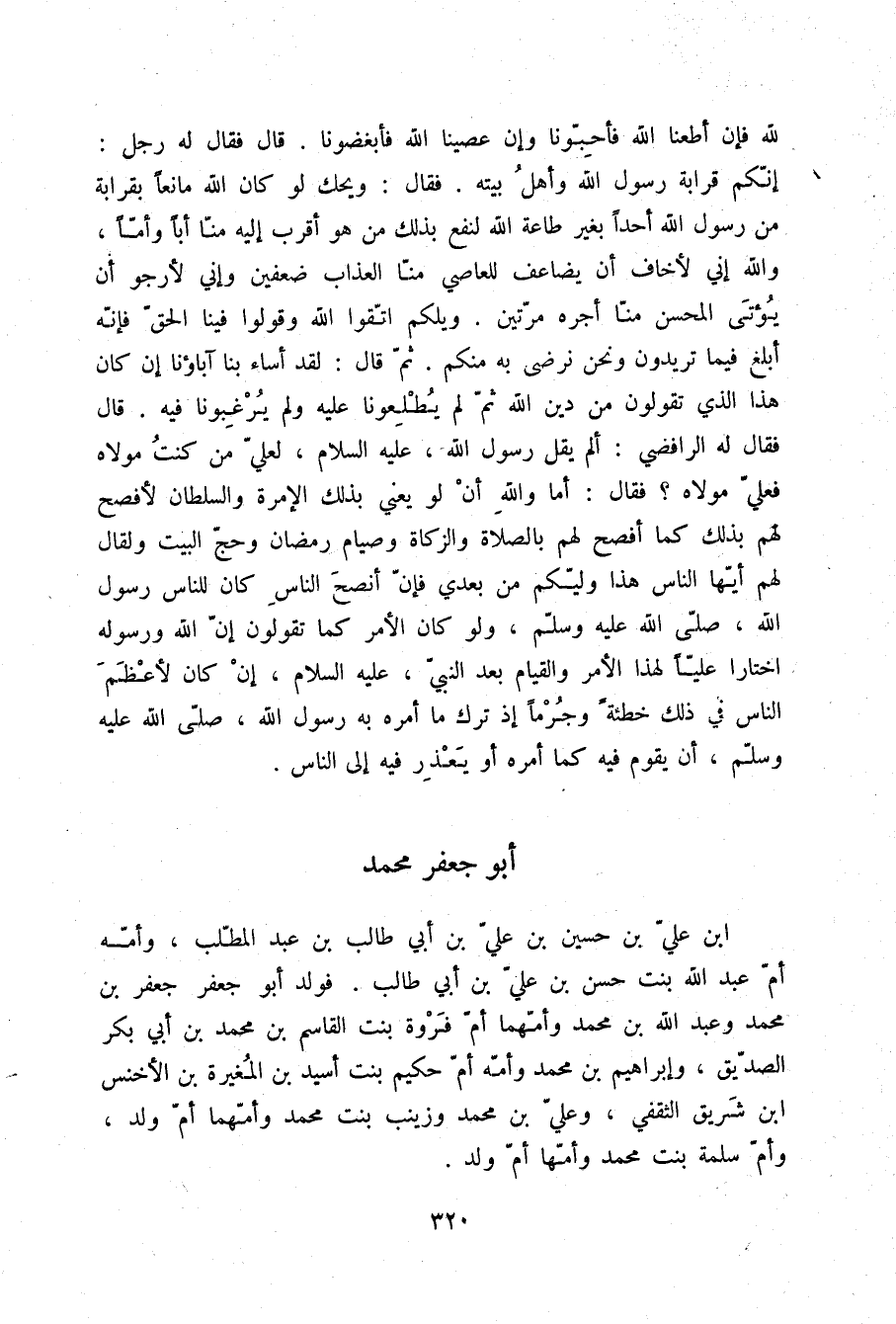 §أَبُو جَعْفَرٍ مُحَمَّدُ بْنُ عَلِيِّ بْنِ حُسَيْنِ بْنِ عَلِيِّ بْنِ أَبِي طَالِبِ بْنِ عَبْدِ الْمُطَّلِبِ وَأُمُّهُ أُمُّ عَبْدِ اللَّهِ بِنْتُ حَسَنِ بْنِ عَلِيِّ بْنِ أَبِي طَالِبٍ , فَوَلَدَ أَبُو جَعْفَرٍ جَعْفَرَ بْنَ مُحَمَّدٍ , وَعَبْدَ اللَّهِ بْنَ مُحَمَّدٍ وَأُمُّهُمَا أُمُّ فَرْوَةَ بِنْتُ الْقَاسِمِ بْنِ مُحَمَّدِ بْنِ أَبِي بَكْرٍ الصِّدِّيقِ , وَإِبْرَاهِيمَ بْنَ مُحَمَّدٍ وَأُمُّهُ أُمُّ حَكِيمٍ بِنْتُ أُسَيْدِ بْنِ الْمُغِيرَةِ بْنِ الْأَخْنَسِ بْنِ شَرِيقٍ الثَّقَفِيِّ , وَعَلِيَّ بْنَ مُحَمَّدٍ , وَزَيْنَبَ بِنْتَ مُحَمَّدٍ وَأُمُّهُمَا أُمُّ وَلَدٍ , وَأُمَّ سَلَمَةَ بِنْتَ مُحَمَّدٍ وَأُمُّهَا أُمُّ وَلَدٍ