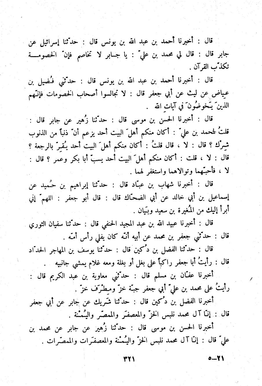 قَالَ: أَخْبَرَنَا الْحَسَنُ بْنُ مُوسَى قَالَ: حَدَّثَنَا زُهَيْرٌ , عَنْ جَابِرٍ قَالَ: قُلْتُ لِمُحَمَّدِ بْنِ عَلِيٍّ: §أَكَانَ مِنْكُمْ أَهْلَ الْبَيْتِ أَحَدٌ يَزْعُمُ أَنَّ ذَنْبًا مِنَ الذُّنُوبِ شِرْكٌ؟ قَالَ: لَا. قَالَ: قُلْتُ أَكَانَ مِنْكُمْ أَهْلَ الْبَيْتِ أَحَدٌ يُقِرُّ بِالرَّجْعَةِ؟ قَالَ: لَا. قُلْتُ: أَكَانَ مِنْكُمْ أَهْلَ الْبَيْتِ أَحَدٌ يَسُبُّ أَبَا بَكْرٍ وَعُمَرَ؟ قَالَ: لَا. فَأَحَبَّهُمَا وَتَوَالَاهُمَا وَاسْتَغْفَرَ لَهُمَا "