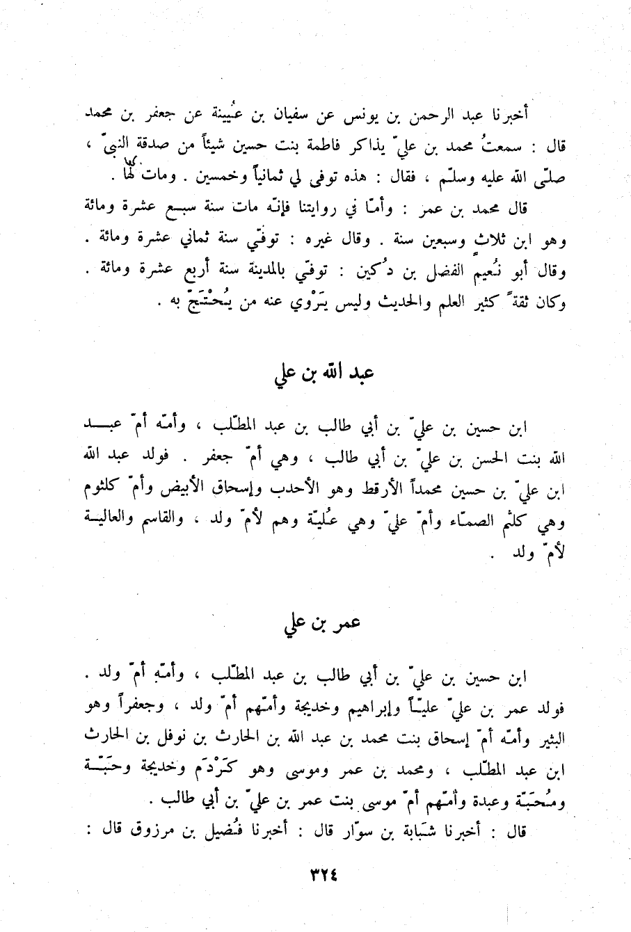 §عُمَرُ بْنُ عَلِيِّ بْنِ حُسَيْنِ بْنِ عَلِيِّ بْنِ أَبِي طَالِبِ بْنِ عَبْدِ الْمُطَّلِبِ وَأُمُّهُ أُمُّ وَلَدٍ , فَوَلَدَ عُمَرُ بْنُ عَلِيٍّ عَلِيًّا , وَإِبْرَاهِيمَ , وَخَدِيجَةَ وَأُمُّهُمْ أُمُّ وَلَدٍ , وَجَعْفَرًا وَهُوَ الْبَثِيرُ وَأُمُّهُ أُمُّ إِسْحَاقَ بِنْتُ مُحَمَّدِ بْنِ عَبْدِ اللَّهِ بْنِ الْحَارِثِ بْنِ نَوْفَلِ بْنِ الْحَارِثِ بْنِ عَبْدِ الْمُطَّلِبِ , وَمُحَمَّدَ بْنَ عُمَرَ , وَمُوسَى وَهُوَ كَرْدَمٌ , وَخَدِيجَةَ وَحَبَّةَ , وَمَحَبَّةَ , وَعَبْدَةَ وَأُمُّهُمْ أُمُّ مُوسَى بِنْتُ عُمَرَ بْنَ عَلِيِّ بْنِ أَبِي طَالِبٍ