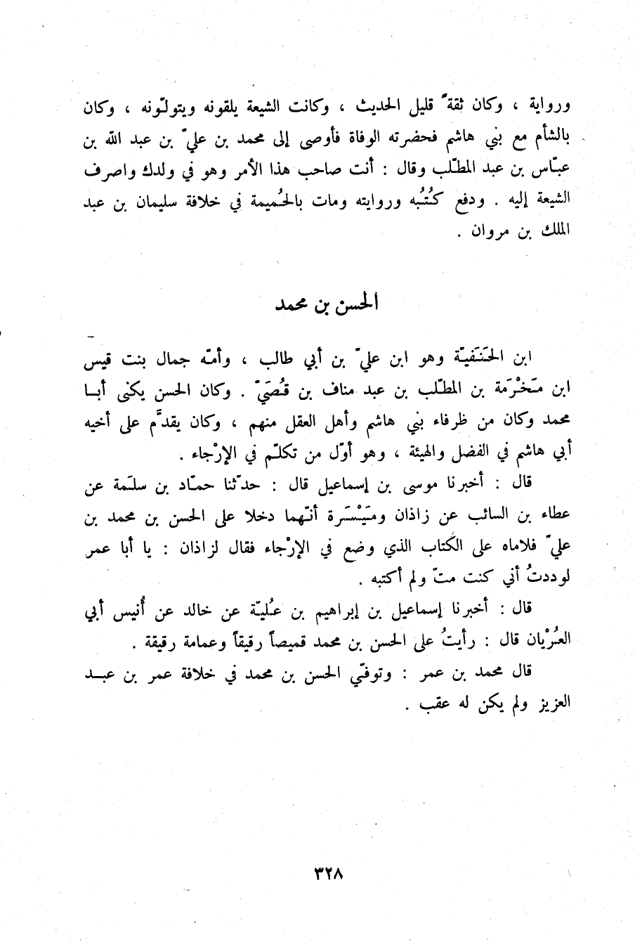 §الْحَسَنُ بْنُ مُحَمَّدِ ابْنِ الْحَنَفِيَّةِ وَهُوَ ابْنُ عَلِيِّ بْنِ أَبِي طَالِبٍ وَأُمُّهُ جَمَالُ بِنْتُ قَيْسِ بْنِ مَخْرَمَةَ بْنِ الْمُطَّلِبِ بْنِ عَبْدِ مَنَافِ بْنِ قُصَيٍّ , وَكَانَ الْحَسَنُ يُكْنَى أَبَا مُحَمَّدٍ , وَكَانَ مِنْ ظُرَفَاءِ بَنِي هَاشِمٍ , وَأَهْلِ الْعَقْلِ مِنْهُمْ , وَكَانَ يُقَدَّمُ عَلَى أَخِيهِ أَبِي هَاشِمٍ فِي الْفَضْلِ وَالْهَيْئَةِ وَهُوَ أَوَّلُ مَنْ تَكَلَّمَ فِي الْإِرْجَاءِ