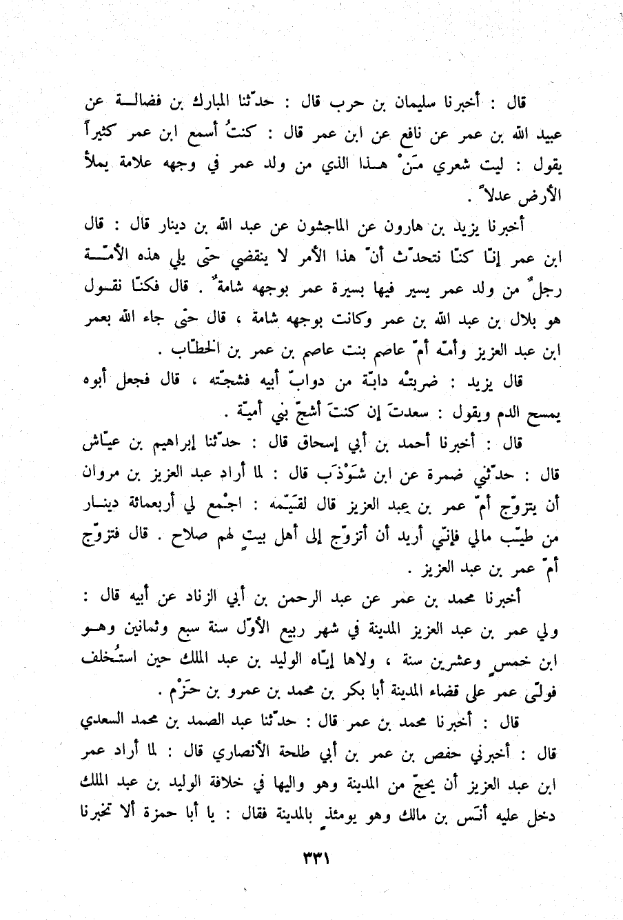 أَخْبَرَنَا يَزِيدُ بْنُ هَارُونَ , عَنِ الْمَاجِشُونِ , عَنْ عَبْدِ اللَّهِ بْنِ دِينَارٍ قَالَ: قَالَ ابْنُ عُمَرَ: §إِنَّا كُنَّا نَتَحَدَّثُ أَنَّ هَذَا الْأَمْرَ لَا يَنْقَضِي حَتَّى يَلِيَ هَذِهِ الْأُمَّةَ رَجُلٌ مِنْ وَلَدِ عُمَرَ يَسِيرُ فِيهَا بِسِيرَةِ عُمَرَ. بِوَجْهِهِ شَامَةٌ. قَالَ فَكُنَّا نَقُولُ هُوَ بِلَالُ بْنُ عَبْدِ اللهِ بْنِ عُمَرَ , وَكَانَتْ بِوَجْهِهِ شَامَةٌ قَالَ: حَتَّى جَاءَ اللَّهُ بِعُمَرَ بْنِ عَبْدِ الْعَزِيزِ وَأُمُّهُ أُمُّ عَاصِمٍ بِنْتُ عَاصِمِ بْنِ عُمَرَ بْنِ الْخَطَّابِ قَالَ يَزِيدُ: ضَرَبَتْهُ دَابَّةٌ مِنْ دَوَابِّ أَبِيهِ فَشَجَّتْهُ. قَالَ: فَجَعَلَ أَبُوهُ يَمْسَحُ الدَّمَ , وَيَقُولُ سَعِدْتَ إِنْ كُنْتَ أَشَجَّ بَنِي أُمَيَّةَ