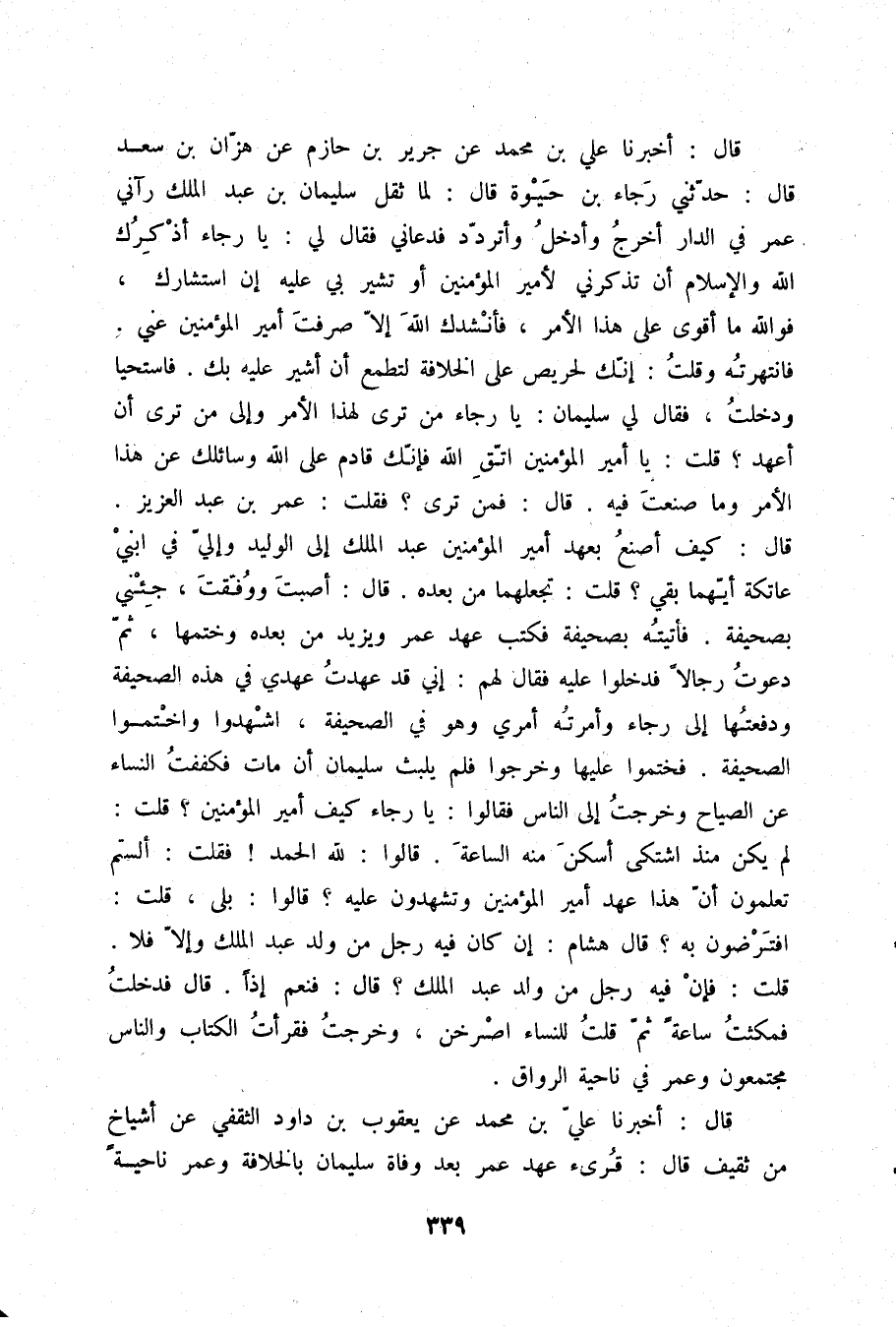 قَالَ: أَخْبَرَنَا عَلِيُّ بْنُ مُحَمَّدٍ , عَنْ جَرِيرِ بْنِ حَازِمٍ , عَنْ هَزَّانَ بْنِ سَعْدٍ قَالَ: حَدَّثَنِي رَجَاءُ بْنُ حَيْوَةَ قَالَ: لَمَّا ثَقُلَ سُلَيْمَانُ بْنُ عَبْدِ الْمَلِكِ رَآنِي عُمَرُ فِي الدَّارِ أَخْرَجُ وَأَدْخَلُ وَأَتَرَدَّدُ , فَدَعَانِي , فَقَالَ لِي: يَا رَجَاءُ , أُذَكِّرُكَ اللَّهَ وَالْإِسْلَامَ أَنْ تَذْكُرَنِي لِأَمِيرِ الْمُؤْمِنِينَ أَوْ تُشِيرَ بِي عَلَيْهِ إِنِ اسْتَشَارَكَ , فَوَاللَّهِ مَا أَقْوَى عَلَى هَذَا الْأَمْرِ , §فَأَنْشُدُكَ اللَّهَ إِلَّا صَرَفْتَ أَمِيرَ الْمُؤْمِنِينَ عَنِّي فَانْتَهَرْتُهُ , وَقُلْتُ: إِنَّكَ لَحَرِيصٌ عَلَى الْخِلَافَةِ لِتَطْمَعَ أَنْ أُشِيرَ عَلَيْهِ بِكَ , فَاسْتَحْيَا , وَدَخَلْتُ , فَقَالَ لِي سُلَيْمَانُ: يَا رَجَاءُ , مَنْ تَرَى لِهَذَا الْأَمْرِ , وَإِلَى مَنْ تَرَى أَنْ أَعْهَدَ؟ قُلْتُ: يَا أَمِيرَ الْمُؤْمِنِينَ , اتَّقِ اللَّهَ؛ فَإِنَّكَ قَادِمٌ عَلَى اللَّهِ وَسَائِلُكَ عَنْ هَذَا الْأَمْرِ , وَمَا صَنَعْتَ فِيهِ. قَالَ: فَمَنْ تَرَى؟ فَقُلْتُ: عُمَرَ بْنَ عَبْدِ الْعَزِيزِ. قَالَ: كَيْفَ أَصْنَعُ بِعَهْدِ أَمِيرِ الْمُؤْمِنِينَ عَبْدِ الْمَلِكِ إِلَى الْوَلِيدِ وَإِلَيَّ فِي ابْنَيْ عَاتِكَةَ أَيُّهُمَا بَقِيَ؟ قُلْتُ: تَجْعَلْهُمَا مِنْ بَعْدِهِ. قَالَ: أَصَبْتَ , وَوُفِّقْتَ. جِئْنِي بِصَحِيفَةٍ , فَأَتَيْتُهُ بِصَحِيفَةٍ , فَكَتَبَ عَهْدَ عُمَرَ وَيَزِيدَ مِنْ بَعْدِهِ وَخَتَمَهَا , ثُمَّ دَعَوْتُ رِجَالًا , فَدَخَلُوا عَلَيْهِ , فَقَالَ لَهُمْ: إِنِّي قَدْ عَهِدْتُ عَهْدِي فِي هَذِهِ الصَّحِيفَةِ , وَدَفَعْتُهَا إِلَى رَجَاءٍ وَأَمَرْتُهُ أَمْرِي وَهُوَ فِي الصَّحِيفَةِ اشْهَدُوا وَاخْتِمُوا الصَّحِيفَةَ , فَخَتَمُوا عَلَيْهَا , وَخَرَجُوا , فَلَمْ يَلْبَثْ سُلَيْمَانُ أَنْ مَاتَ , فَكَفَفْتُ النِّسَاءَ عَنِ الصَّيَّاحِ , وَخَرَجْتُ إِلَى النَّاسِ , فَقَالَوا: يَا رَجَاءُ , كَيْفَ أَمِيرُ الْمُؤْمِنِينَ؟ قُلْتُ: لَمْ يَكُنْ مُنْذُ اشْتَكَى أَسْكَنَ مِنْهُ السَّاعَةَ. قَالُوا: لِلَّهِ الْحَمْدُ , فَقُلْتُ: أَلَسْتُمْ تَعْلَمُونَ أَنَّ هَذَا عَهْدُ أَمِيرِ الْمُؤْمِنِينَ , وَتَشْهَدُونَ عَلَيْهِ؟ قَالُوا: بَلَى. قُلْتُ: افَتَرْضَوْنَ بِهِ؟ قَالَ: هِشَامٌ إِنْ كَانَ فِيهِ رَجُلٌ مِنْ وَلَدِ عَبْدِ الْمَلِكِ , وَإِلَّا فَلَا. قُلْتُ: فَإِنَّ فِيهِ رَجُلٌ مِنْ وَلَدِ عَبْدِ الْمَلِكِ. قَالَ: فَنَعَمْ إِذًا. قَالَ: فَدَخَلْتُ , فَمَكَثْتُ سَاعَةً , ثُمَّ قُلْتُ لِلنِّسَاءِ: اصْرُخْنَ , وَخَرَجْتُ , فَقَرَأْتُ الْكِتَابَ وَالنَّاسُ مُجْتَمِعُونَ , وَعُمَرُ فِي نَاحِيَةِ الرَّوَاقِ "