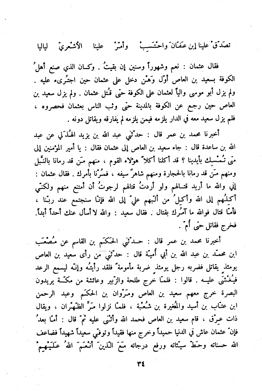 أَخْبَرَنَا مُحَمَّدُ بْنُ عُمَرَ , قَالَ: حَدَّثَنِي عَبْدُ اللَّهِ بْنُ يَزِيدَ الْهُذَلِيُّ , عَنْ عَبْدِ اللَّهِ بْنِ سَاعِدَةَ , قَالَ: جَاءَ سَعِيدُ بْنُ الْعَاصِ إِلَى عُثْمَانَ , فَقَالَ: يَا أَمِيرَ الْمُؤْمِنِينَ , §إِلَى مَتَى تُمْسِكَ بِأَيْدِينَا؟ قَدْ أَكَلَنَا أَكْلًا هَؤُلَاءِ الْقَوْمُ مِنْهُمْ مَنْ قَدْ رَمَانَا بِالنَّبْلِ , وَمِنْهُمْ مَنْ قَدْ رَمَانَا بِالْحِجَارَةِ , وَمِنْهُمْ شَاهِرٌ سَيْفَهُ , فَمُرْنَا بِأَمْرِكَ , فَقَالَ عُثْمَانُ: إِنِّي وَاللَّهِ , مَا أُرِيدُ قِتَالَهُمْ , وَلَوْ أَرَدْتُ قِتَالَهُمْ لَرَجَوْتُ أَنْ أَمْتَنِعَ مِنْهُمْ وَلَكِنِّي أَكِلُهُمْ إِلَى اللَّهِ , وَأَكِلُ مِنَ أَلَّبَهُمْ عَلَيَّ إِلَى اللَّهِ؛ فَإِنَّا سَنَجْتَمِعُ عِنْدَ رَبِّنَا , فَأَمَّا قِتَالٌ فَوَاللَّهِ مَا آمُرُكَ بِقِتَالٍ , فَقَالَ سَعِيدٌ: وَاللَّهِ , لَا أَسْأَلُ عَنْكَ أَحَدًا أَبَدًا فَخَرَجَ , فَقَاتَلَ حَتَّى أُمَّ " أَخْبَرَنَا مُحَمَّدُ بْنُ عُمَرَ , قَالَ: حَدَّثَنِي الْحَكَمُ بْنُ الْقَاسِمِ , عَنْ مُصْعَبِ بْنِ مُحَمَّدِ بْنِ عَبْدِ اللَّهِ بْنِ أَبِي أُمَيَّةَ , قَالَ: حَدَّثَنِي مَنْ رَأَى سَعِيدَ بْنَ الْعَاصِ يَوْمَئِذٍ يُقَاتِلُ , فَضَرَبَهُ رَجُلٌ يَوْمَئِذٍ ضَرْبَةً مَأْمُومَةً , فَلَقَدْ رَأَيْتُهُ وَإِنَّهُ لَيَسْمَعُ الرَّعْدَ , فَيُغْشَى عَلَيْهِ. قَالُوا: فَلَمَّا خَرَجَ طَلْحَةُ , وَالزُّبَيْرُ , وَعَائِشَةُ مِنْ مَكَّةَ يُرِيدُونَ الْبَصْرَةَ خَرَجَ مَعَهُمْ سَعِيدُ بْنُ الْعَاصِ , وَمَرْوَانُ بْنُ الْحَكَمِ , وَعَبْدُ الرَّحْمَنِ بْنُ عَتَّابِ بْنِ أُسَيْدٍ , وَالْمُغِيرَةُ بْنُ شُعْبَةَ , فَلَمَّا نَزَلُوا مَرَّ الظَّهْرَانِ - وَيُقَالُ: ذَاتُ عِرْقٍ - قَامَ سَعِيدُ بْنُ الْعَاصِ فَحَمِدَ اللَّهَ وَأَثْنَى عَلَيْهِ , ثُمَّ قَالَ: أَمَّا بَعْدُ , فَإِنَّ عُثْمَانَ عَاشَ فِي الدُّنْيَا حَمِيدًا , وَخَرَجَ مِنْهَا فَقِيدًا , وَتُوُفِّيَ سَعِيدًا شَهِيدًا , فَضَاعَفَ اللَّهُ حَسَنَاتِهِ , وَحَطَّ سَيِّئَاتِهِ , وَرَفَعَ دَرَجَاتِهِ مَعَ الَّذِينَ أَنْعَمَ اللَّهُ عَلَيْهِمْ