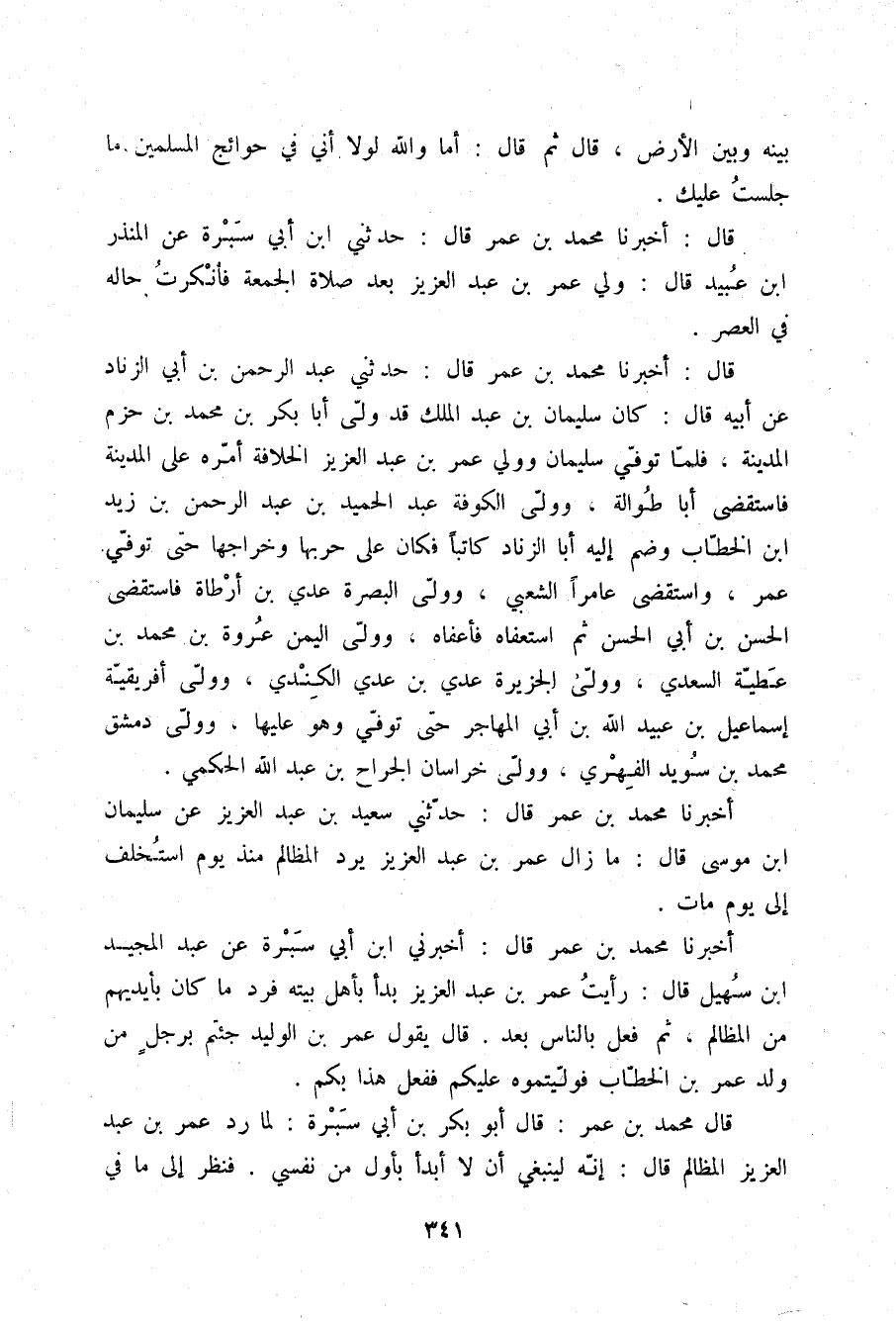 أَخْبَرَنَا مُحَمَّدُ بْنُ عُمَرَ قَالَ: حَدَّثَنِي سَعِيدُ بْنُ عَبْدِ الْعَزِيزِ , عَنْ سُلَيْمَانَ بْنِ مُوسَى قَالَ: مَا زَالَ عُمَرُ بْنُ عَبْدِ الْعَزِيزِ §يَرُدُّ الْمَظَالِمَ مُنْذُ يَوْمِ اسْتُخْلِفَ إِلَى يَوْمِ مَاتَ "