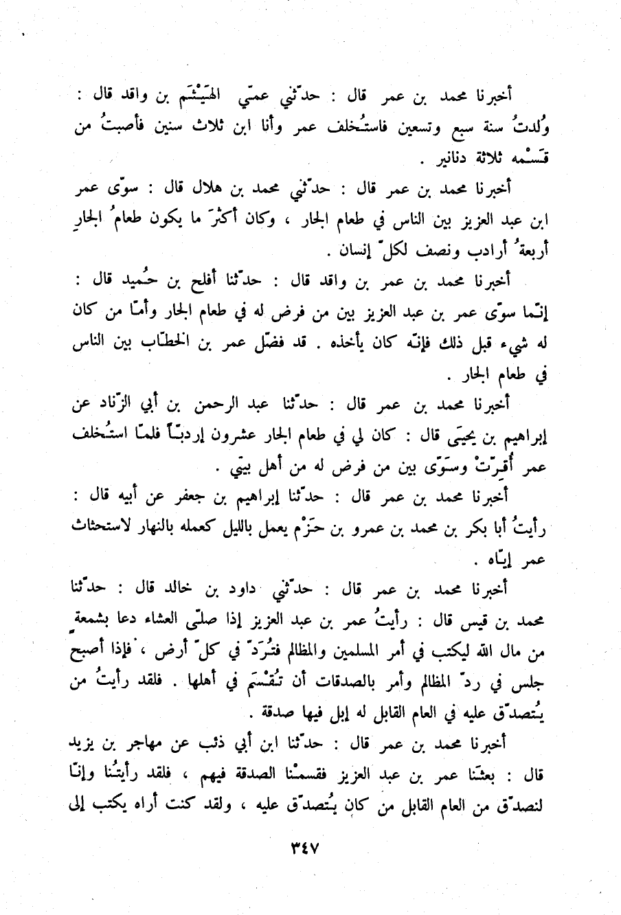 أَخْبَرَنَا مُحَمَّدُ بْنُ عُمَرَ قَالَ: حَدَّثَنِي دَاوُدُ بْنُ خَالِدٍ قَالَ: حَدَّثَنَا مُحَمَّدُ بْنُ قَيْسٍ قَالَ: رَأَيْتُ عُمَرَ بْنَ عَبْدِ الْعَزِيزِ إِذَا صَلَّى الْعِشَاء §دَعَا بِشَمْعَةٍ مِنْ مَالِ اللَّهِ لِيَكْتُبَ فِي أَمْرِ الْمُسْلِمِينَ وَالْمَظَالِمِ فَتُرَدُّ فِي كُلِّ أَرْضٍ , فَإِذَا أَصْبَحَ جَلَسَ فِي رَدِّ الْمَظَالِمِ وَأَمَرَ بِالصَّدَقَاتِ أَنْ تُقَسَّمَ فِي أَهْلِهَا , فَلَقَدْ رَأَيْتُ مَنْ يُتَصَدَّقُ عَلَيْهِ فِي الْعَامِ الْقَابِلِ لَهُ إِبِلٌ فِيهَا صَدَقَةٌ "
