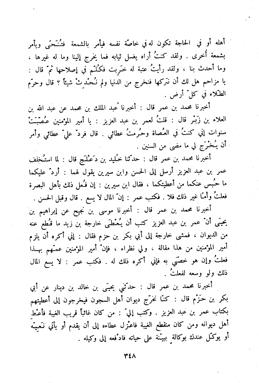 أَخْبَرَنَا مُحَمَّدُ بْنُ عُمَرَ قَالَ: أَخْبَرَنَا عَبْدُ الْمَلِكِ بْنُ مُحَمَّدٍ , عَنْ عَبْدِ اللَّهِ بْنِ الْعَلَاءِ بْنِ زَبْرٍ قَالَ: قُلْتُ لِعُمَرَ بْنِ عَبْدِ الْعَزِيزِ: §يَا أَمِيرَ الْمُؤْمِنِينَ , عُصِّبَتْ سَنَوَاتٌ. إِنِّي كُنْتُ فِي الْعُصَاةِ , وَحَرَّمْتَ عَطَائِي. قَالَ: فَرَدَّ عَلَيَّ عَطَائِي , وَأَمَرَ أَنْ يُخْرَجَ لِي مَا مَضَى مِنَ السِّنِينَ "
