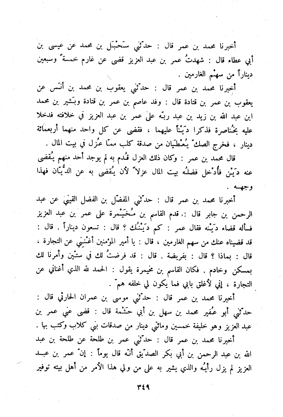أَخْبَرَنَا مُحَمَّدُ بْنُ عُمَرَ قَالَ: حَدَّثَنِي مُوسَى بْنُ عِمْرَانَ الْحَارِثِيُّ قَالَ: حَدَّثَنِي أَبُو عُفَيْرٍ مُحَمَّدُ بْنُ سَهْلِ بْنِ أَبِي حَثْمَةَ قَالَ: §قَضَى عَنِّي عُمَرُ بْنُ عَبْدِ الْعَزِيزِ وَهُوَ خَلِيفَةٌ خَمْسِينَ وَمِائَتَيْ دِينَارٍ مِنْ صَدَقَاتِ بَنِي كِلَابٍ , وَكَتَبَ بِهَا "