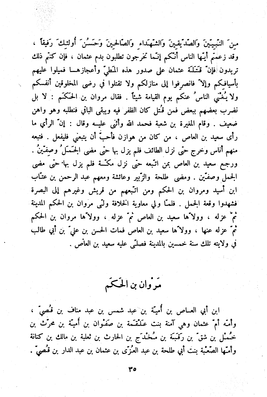 مِنَ النَّبِيِّينَ وَالصِّدِّيقِينَ وَالشُّهَدَاءِ وَالصَّالِحِينَ وَحَسُنَ أُولَئِكَ رَفِيقًا , وَقَدْ زَعَمْتُمْ أَيُّهَا النَّاسُ , أَنَّكُمْ إِنَّمَا تَخْرُجُونَ تَطْلُبُونَ بِدَمِ عُثْمَانَ , فَإِنْ كُنْتُمْ ذَلِكَ تُرِيدُونَ فَإِنَّ قَتَلَةَ عُثْمَانَ عَلَى صُدُورِ هَذِهِ الْمَطِيِّ وَأَعْجَازِهَا , فَمِيلُوا عَلَيْهِمْ بِأَسْيَافِكُمْ وَإِلَّا فَانْصَرِفُوا إِلَى مَنَازِلِكُمْ , وَلَا تَقْتُلُوا فِي رَضَى الْمَخْلُوقِينَ أَنْفُسَكُمْ , وَلَا يُغْنِي النَّاسُ عَنْكُمْ يَوْمَ الْقِيَامَةِ شَيْئًا , فَقَالَ مَرْوَانُ بْنُ الْحَكَمِ: لَا بَلْ نَضْرِبُ بَعْضَهُمْ بِبَعْضٍ , فَمَنْ قُتِلَ كَانَ الظَّفْرُ فِيهِ وَيَبْقَى الْبَاقِي فَنَطْلُبُهُ وَهُوَ وَاهِنٌ ضَعِيفٌ , وَقَامَ الْمُغِيرَةُ بْنُ شُعْبَةَ , فَحَمِدَ اللَّهَ , وَأَثْنَى عَلَيْهِ , وَقَالَ: إِنَّ الرَّأْيَ مَا رَأَى سَعِيدُ بْنُ الْعَاصِ , مَنْ كَانَ مِنْ هَوَازِنَ فَأَحَبَّ أَنْ يَتَّبِعَنِي فَلْيَفْعَلْ , فَتَبِعَهُ مِنْهُمْ أُنَاسٌ , وَخَرَجَ حَتَّى نَزَلَ الطَّائِفَ , فَلَمْ يَزَلْ بِهَا حَتَّى مَضَى الْجَمَلُ وَصِفِّينُ , وَرَجَعَ سَعِيدُ بْنُ الْعَاصِ بِمَنِ اتَّبَعَهُ حَتَّى نَزَلَ مَكَّةَ , فَلَمْ يَزَلْ بِهَا حَتَّى مَضَى الْجَمَلُ وَصِفِّينُ , وَمَضَى طَلْحَةُ وَالزُّبَيْرُ وَعَائِشَةُ وَمَعَهُمْ عَبْدُ الرَّحْمَنِ بْنُ عَتَّابِ بْنِ أُسَيْدٍ , وَمَرْوَانُ بْنُ الْحَكَمِ وَمَنِ اتَّبَعَهُمْ مِنْ قُرَيْشٍ وَغَيْرِهِمْ إِلَى الْبَصْرَةِ , فَشَهِدُوا وَقْعَةَ الْجَمَلِ , فَلَمَّا وَلِيَ مُعَاوِيَةُ الْخِلَافَةَ وَلَّى مَرْوَانَ بْنَ الْحَكَمِ الْمَدِينَةَ , ثُمَّ عَزَلَهُ , وَوَلَّاهَا سَعِيدُ بْنُ الْعَاصِ , ثُمَّ عَزَلَهُ , وَوَلَّاهَا مَرْوَانَ بْنَ الْحَكَمِ , ثُمَّ عَزَلَهُ عَنْهَا , وَوَلَّاهَا سَعِيدَ بْنَ الْعَاصِ , فَمَاتَ الْحَسَنُ بْنُ عَلِيِّ بْنِ أَبِي طَالِبٍ فِي وِلَايَتِهِ تِلْكَ سَنَةَ خَمْسِينَ بِالْمَدِينَةِ , فَصَلَّى عَلَيْهِ سَعِيدُ بْنُ الْعَاصِ