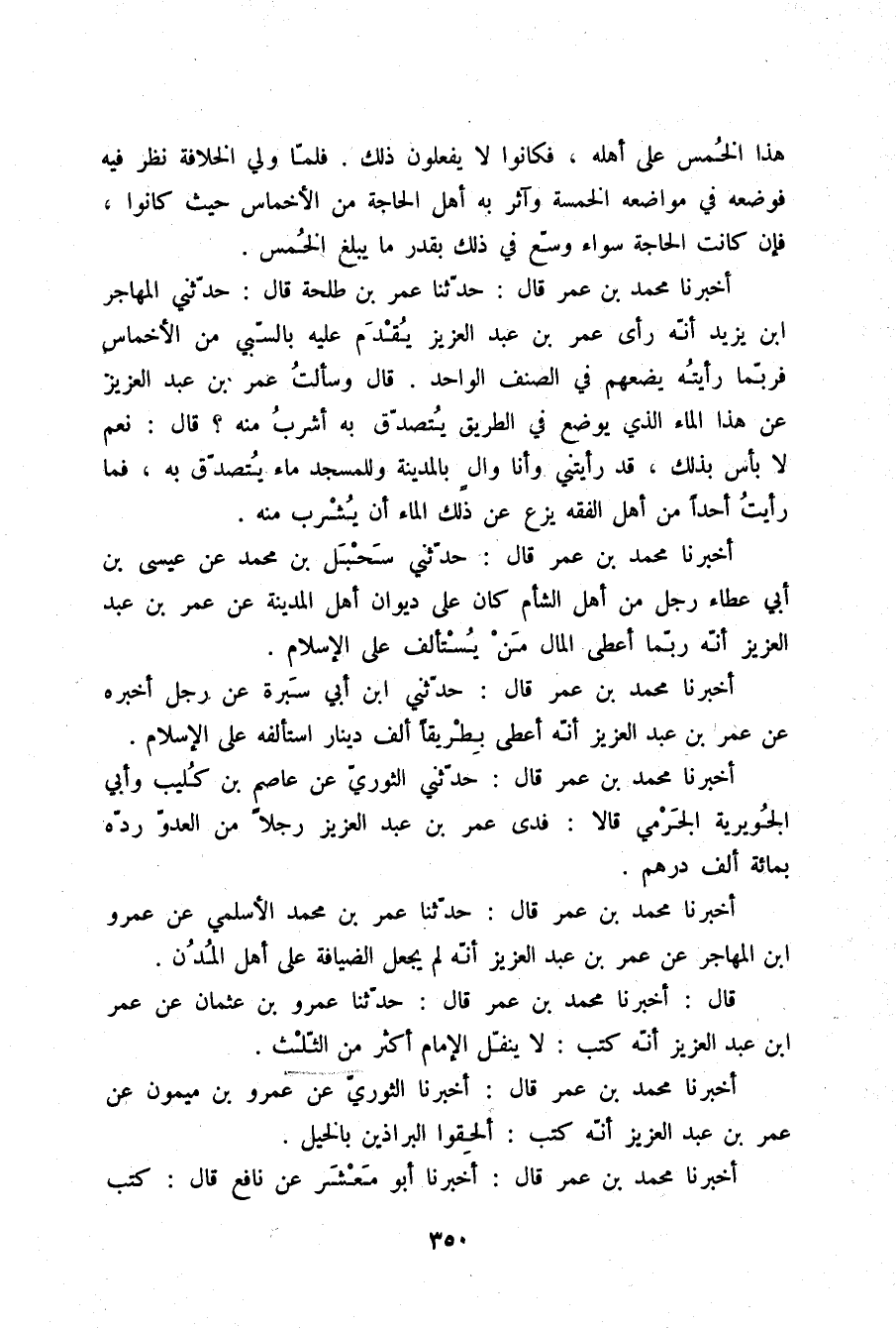 أَخْبَرَنَا مُحَمَّدُ بْنُ عُمَرَ قَالَ: حَدَّثَنَا عُمَرُ بْنُ طَلْحَةَ قَالَ: حَدَّثَنِي الْمُهَاجِرُ بْنُ يَزِيدَ أَنَّهُ رَأَى عُمَرَ بْنَ عَبْدِ الْعَزِيزِ يَقْدَمُ عَلَيْهِ بِالسَّبْيِ مِنَ الْأَخْمَاسِ , فَرُبَّمَا رَأَيْتُهُ يَضَعُهُمْ فِي الصِّنْفِ الْوَاحِدِ. قَالَ: وَسَأَلْتُ عُمَرَ بْنَ عَبْدِ الْعَزِيزِ عَنْ هَذَا الْمَاءِ الَّذِي يُوضَعُ فِي الطَّرِيقِ يُتَصَدَّقُ بِهِ. أَشْرَبُ مِنْهُ؟ قَالَ: نَعَمْ , §لَا بَأْسَ بِذَلِكَ قَدْ رَأَيْتُنِي وَأَنَا وَالٍ بِالْمَدِينَةِ , وَلِلْمَسْجِدِ مَاءٌ يُتَصَدَّقُ بِهِ , فَمَا رَأَيْتُ أَحَدًا مِنْ أَهْلِ الْفِقْهِ يَزَعُ عَنْ ذَلِكَ الْمَاءِ أَنْ يُشْرَبَ مِنْهُ "