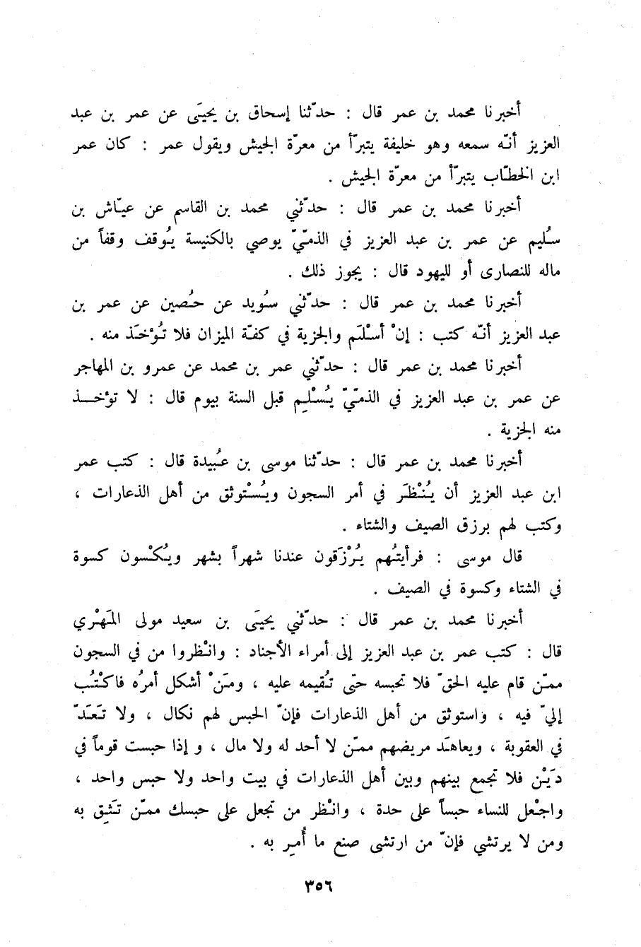 أَخْبَرَنَا مُحَمَّدُ بْنُ عُمَرَ , قَالَ: حَدَّثَنِي يَحْيَى بْنُ سَعِيدٍ , مَوْلَى الْمَهْرِيِّ قَالَ: §كَتَبَ عُمَرُ بْنُ عَبْدِ الْعَزِيزِ إِلَى أُمَرَاءِ الْأَجْنَادِ وَانْظُرُوا مَنْ فِي السُّجُونِ مِمَّنْ قَامَ عَلَيْهِ الْحَقُّ فَلَا تَحْبِسْهُ حَتَّى تُقِيمَهُ عَلَيْهِ , وَمَنْ أَشْكَلَ أَمَرُهُ فَاكْتُبْ إِلَيَّ فِيهِ , وَاسْتَوْثِقْ مِنْ أَهْلِ الذِّعَارَاتِ فَإِنَّ الْحَبْسَ لَهُمْ نَكَالٌ , وَلَا تَعَدَّ فِي الْعُقُوبَةِ وَيُعَاهَدُ مَرِيضُهُمْ مِمَّنْ لَا أَحَدَ لَهُ وَلَا مَالَ , وَإِذَا حَبَسْتَ قَوْمًا فِي دَيْنٍ فَلَا تَجْمَعْ بَيْنَهُمْ وَبَيْنَ أَهْلِ الذِّعَارَاتِ فِي بَيْتٍ وَاحِدٍ , وَلَا حَبَسَ وَاحِدٍ , وَاجْعَلْ لِلنِّسَاءِ حَبْسًا عَلَى حِدَةٍ , وَانْظُرْ مَنْ تَجْعَلَ عَلَى حَبَسِكَ مِمَّنْ تَثِقُ بِهِ , وَمَنْ لَا يَرْتَشِي فَإِنَّ مَنِ ارْتَشَى صَنَعَ مَا أُمِرَ بِهِ "