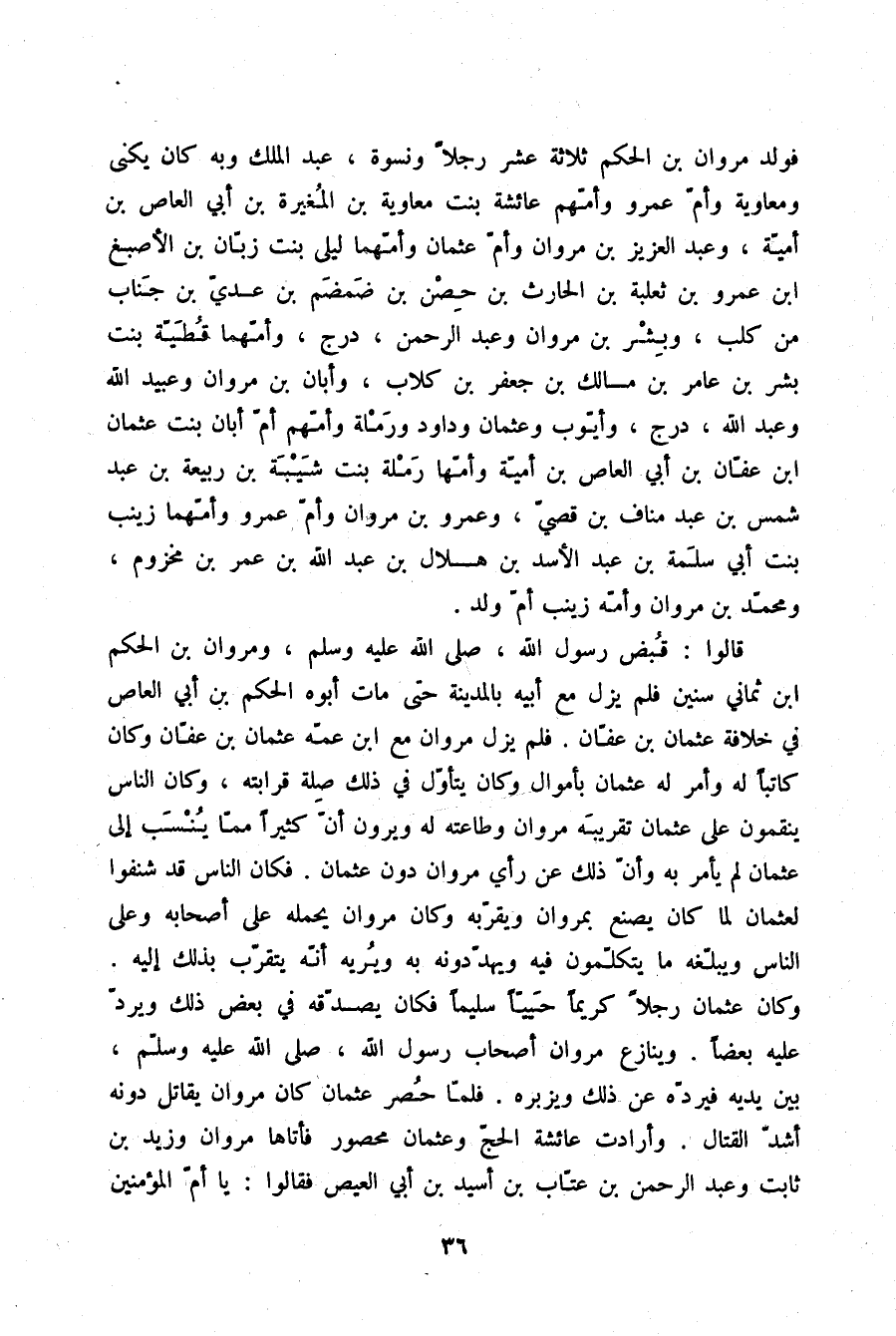 فَوَلَدَ مَرْوَانُ بْنُ الْحَكَمِ ثَلَاثَةَ عَشَرَ رَجُلًا وَنِسْوَةً: عَبْدَ الْمَلِكِ وَبِهِ كَانَ يُكْنَى , وَمُعَاوِيَةَ , وَأُمَّ عَمْرٍو وَأُمُّهُمْ عَائِشَةُ بِنْتُ مُعَاوِيَةَ بْنِ الْمُغِيرَةِ بْنِ أَبِي الْعَاصِ بْنِ أُمَيَّةَ , وَعَبْدَ الْعَزِيزِ بْنِ مَرْوَانَ , وَأُمَّ عُثْمَانَ وَأُمُّهُمَا لَيْلَى بِنْتُ زَبَّانَ بْنِ الْأَصْبَغِ بْنِ عَمْرِو بْنِ ثَعْلَبَةَ بْنِ الْحَارِثِ بْنِ حِصْنِ بْنِ ضَمْضَمَ بْنِ عَدِيِّ بْنِ جَنَابٍ مِنْ كَلْبٍ , وَبِشْرَ بْنَ مَرْوَانَ , وَعَبْدَ الرَّحْمَنِ دَرَجَ وَأُمُّهُمَا قُطَيَّةُ بِنْتُ بِشْرِ بْنِ عَامِرِ بْنِ مَالِكِ بْنِ جَعْفَرِ بْنِ كِلَابٍ , وَأَبَانَ بْنَ مَرْوَانَ , وَعُبَيْدَ اللَّهِ , وَعَبْدَ اللَّهِ دَرَجَ , وَأَيُّوبَ , وَعُثْمَانَ , وَدَاوُدَ , وَرَمْلَةَ وَأُمُّهُمْ أُمُّ أَبَانَ بِنْتِ عُثْمَانَ بْنِ عَفَّانَ بْنِ أَبِي الْعَاصِ بْنِ أُمَيَّةَ وَأُمُّهَا رَمْلَةُ بِنْتُ شَيْبَةَ بْنِ رَبِيعَةَ بْنِ عَبْدِ شَمْسِ بْنِ عَبْدِ مَنَافِ بْنِ قُصَيٍّ , وَعَمْرَو بْنَ مَرْوَانَ , وَأُمَّ عَمْرٍو وَأُمُّهُمَا زَيْنَبُ بِنْتُ أَبِي سَلَمَةَ بْنِ عَبْدِ الْأَسَدِ بْنِ هِلَالِ بْنِ عَبْدِ اللَّهِ بْنِ عُمَرَ بْنِ مَخْزُومٍ , وَمُحَمَّدَ بْنَ مَرْوَانَ وَأُمُّهُ زَيْنَبُ أُمُّ وَلَدٍ. قَالُوا قُبِضَ رَسُولُ اللَّهِ صلّى الله عليه وسلم وَمَرْوَانُ بْنُ الْحَكَمِ ابْنُ ثَمَانِي سِنِينَ , فَلَمْ يَزَلْ مَعَ أَبِيهِ بِالْمَدِينَةِ حَتَّى مَاتَ أَبُوهُ الْحَكَمُ بْنُ أَبِي الْعَاصِ فِي خِلَافَةِ عُثْمَانَ بْنِ عَفَّانَ , فَلَمْ يَزَلْ مَرْوَانُ مَعَ ابْنِ عَمِّهِ عُثْمَانَ بْنِ عَفَّانَ , وَكَانَ كَاتِبًا لَهُ , وَأَمَرَ لَهُ عُثْمَانُ بِأَمْوَالٍ , وَكَانَ يَتَأَوَّلُ فِي ذَلِكَ صِلَةَ قَرَابَتِهِ , وَكَانَ النَّاسُ يَنْقِمُونَ عَلَى عُثْمَانَ تَقْرِيبَهُ مَرْوَانَ , وَطَاعَتَهُ لَهُ , وَيَرَوْنَ أَنَّ كَثِيرًا مِمَّا يُنْسَبُ إِلَى عُثْمَانَ لَمْ يَأْمُرْ بِهِ وَأَنَّ ذَلِكَ عَنْ رَأْيِ مَرْوَانَ دُونَ عُثْمَانَ , فَكَانَ النَّاسُ قَدْ شَنِفُوا لِعُثْمَانَ لَمَّا كَانَ يَصْنَعُ بِمَرْوَانَ وَيُقَرِّبُهُ , وَكَانَ مَرْوَانُ يَحْمِلُهُ عَلَى أَصْحَابِهِ وَعَلَى النَّاسِ , وَيُبَلِّغُهُ مَا يَتَكَلَّمُونَ فِيهِ , وَيُهَدِّدُونَهُ بِهِ , وَيُرِيهُ أَنَّهُ يَتَقَرَّبُ بِذَلِكَ إِلَيْهِ , وَكَانَ عُثْمَانُ رَجُلًا كَرِيمًا حَيِيًّا سَلِيمًا , فَكَانَ يُصَدِّقُهُ فِي بَعْضِ ذَلِكَ , وَيَرُدُّ عَلَيْهِ بَعْضًا , وَيُنَازِعُ مَرْوَانُ أَصْحَابَ رَسُولِ اللَّهِ صلّى الله عليه وسلم بَيْنَ يَدَيْهِ , فَيَرُدُّهُ عَنْ ذَلِكَ , وَيَزْبُرُهُ , فَلَمَّا حُصِرَ عُثْمَانُ كَانَ مَرْوَانُ يُقَاتِلُ دُونَهُ أَشَدَّ الْقِتَالِ , وَأَرَادَتْ عَائِشَةُ الْحَجَّ وَعُثْمَانُ مَحْصُورٌ , فَأَتَاهَا مَرْوَانُ , وَزَيْدُ بْنُ ثَابِتٍ , وَعَبْدُ الرَّحْمَنِ بْنُ عَتَّابِ بْنِ أُسَيْدِ بْنِ أَبِي الْعَيْصِ , فَقَالُوا: يَا أُمَّ الْمُؤْمِنِينَ ,