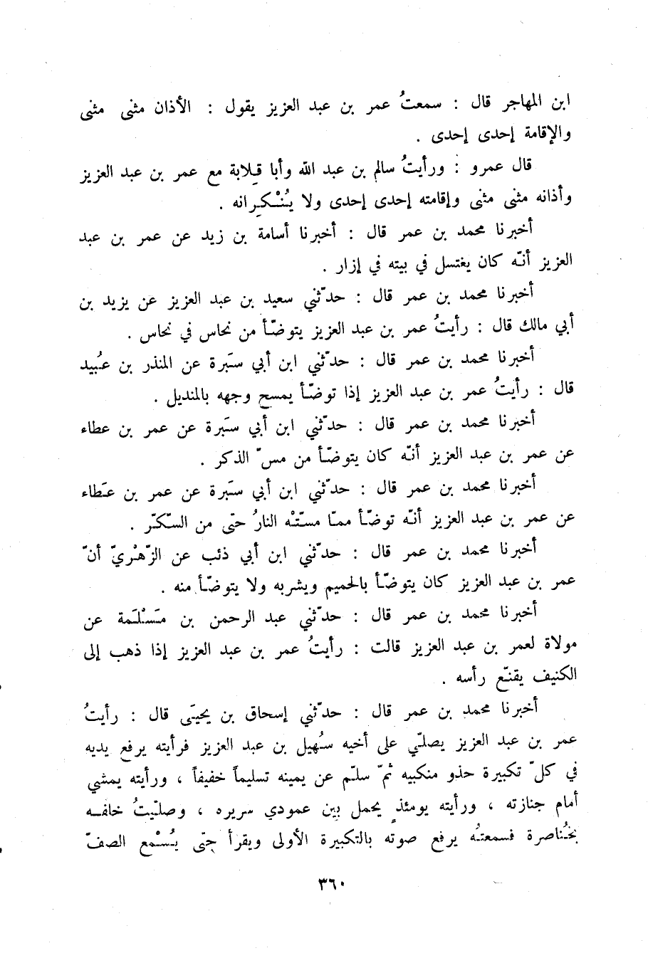 أَخْبَرَنَا مُحَمَّدُ بْنُ عُمَرَ قَالَ: حَدَّثَنِي عَبْدُ الرَّحْمَنِ بْنُ مَسْلَمَةَ , عَنْ مَوْلَاةٍ لِعُمَرَ بْنِ عَبْدِ الْعَزِيزِ قَالَتْ: رَأَيْتُ عُمَرَ بْنَ عَبْدِ الْعَزِيزِ §إِذَا ذَهَبَ إِلَى الْكَنِيفِ يُقَنِّعُ رَأْسَهُ "