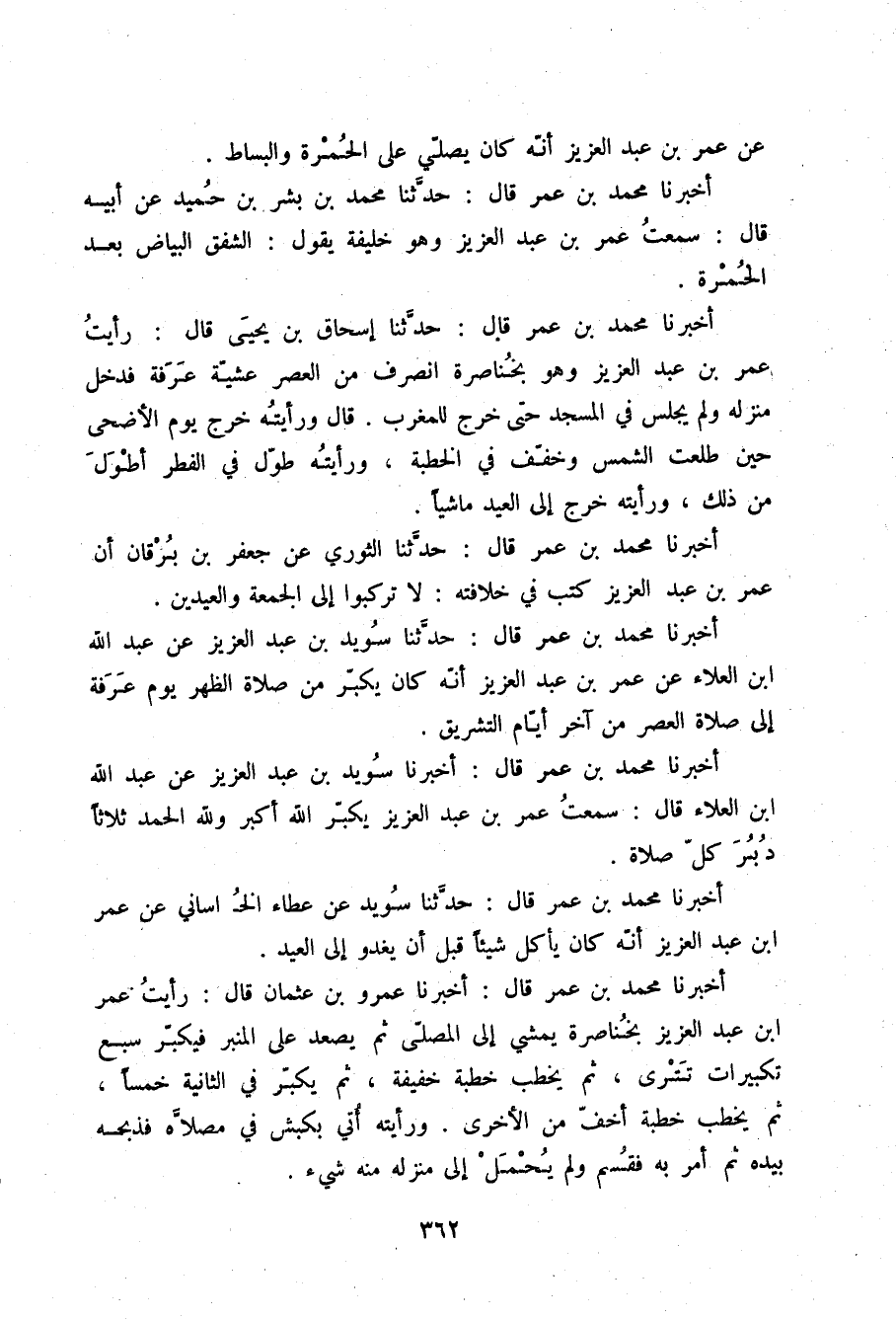أَخْبَرَنَا مُحَمَّدُ بْنُ عُمَرَ قَالَ: حَدَّثَنَا إِسْحَاقُ بْنُ يَحْيَى قَالَ: §رَأَيْتُ عُمَرَ بْنَ عَبْدِ الْعَزِيزِ وَهُوَ بِخُنَاصِرَةَ انْصَرَفَ مِنَ الْعَصْرِ عَشِيَّةَ عَرَفَةَ , فَدَخَلَ مَنْزِلَهُ , وَلَمْ يَجْلِسْ فِي الْمَسْجِدِ حَتَّى خَرَجَ لِلْمَغْرِبِ " قَالَ: وَرَأَيْتُهُ خَرَجَ يَوْمَ الْأَضْحَى حِينَ طَلَعَتِ الشَّمْسُ وَخَفَّفَ فِي الْخُطْبَةِ , وَرَأَيْتُهُ طَوَّلَ فِي الْفِطْرِ أَطْوَلَ مِنْ ذَلِكَ , وَرَأَيْتُهُ خَرَجَ إِلَى الْعِيدِ مَاشِيًا
