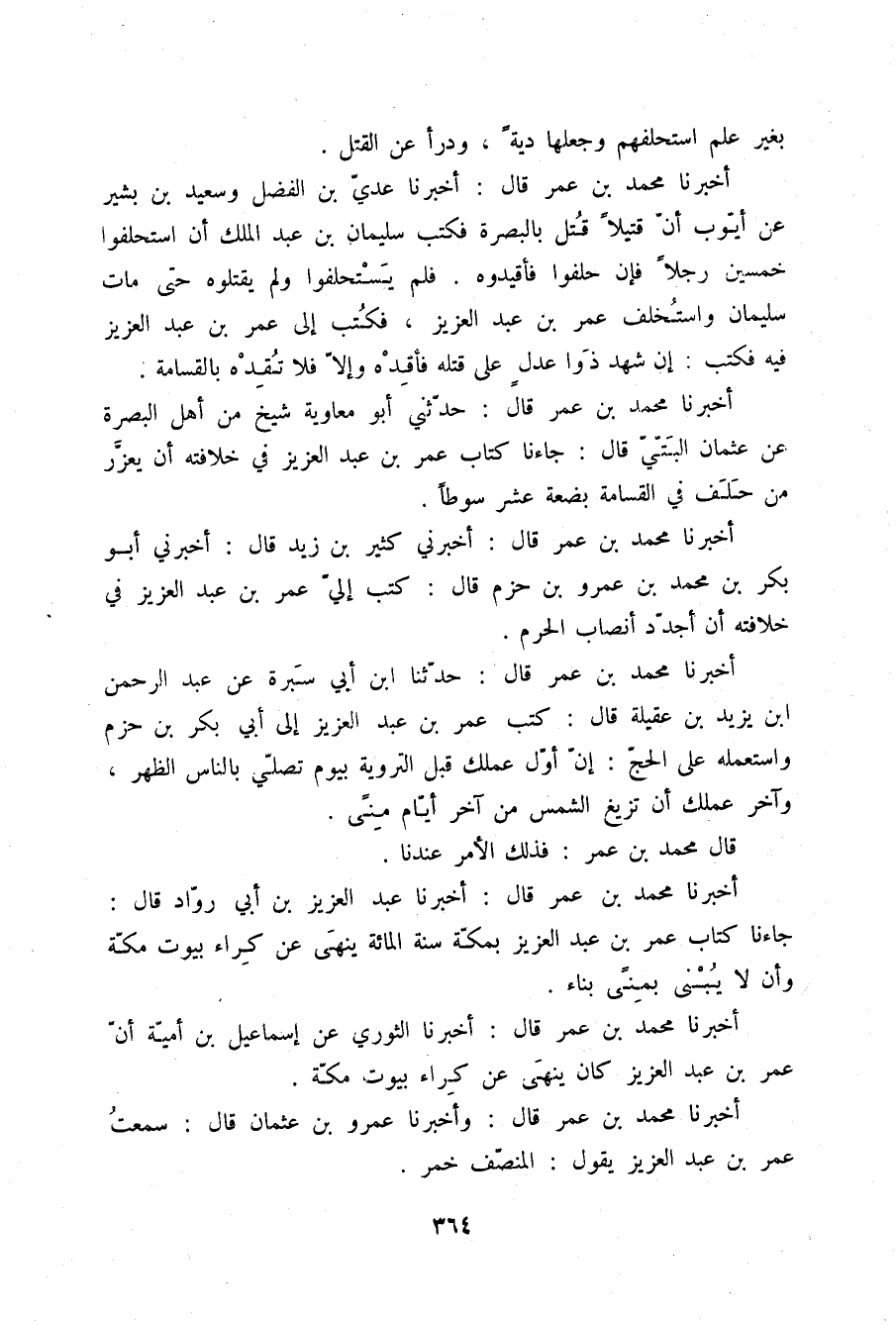 أَخْبَرَنَا مُحَمَّدُ بْنُ عُمَرَ قَالَ: أَخْبَرَنَا عَبْدُ الْعَزِيزِ بْنُ أَبِي رَوَّادٍ قَالَ: جَاءَنَا كِتَابُ عُمَرَ بْنِ عَبْدِ الْعَزِيزِ بِمَكَّةَ سَنَةَ الْمِائَةِ §يَنْهَى عَنْ كِرَاءِ بُيُوتِ مَكَّةَ , وَأَنْ لَا يُبْنَى بِمِنًى بِنَاءٌ "