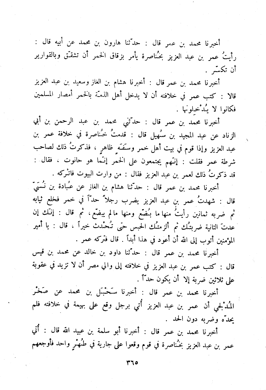 أَخْبَرَنَا مُحَمَّدُ بْنُ عُمَرَ قَالَ: أَخْبَرَنَا هِشَامُ بْنُ الْغَازِ وَسَعِيدُ بْنُ عَبْدِ الْعَزِيزِ قَالَا: كَتَبَ عُمَرُ فِي خِلَافَتِهِ أَنْ §لَا يَدْخُلَ أَهْلُ الذِّمَّةِ بِالْخَمْرِ أَمْصَارَ الْمُسْلِمِينَ , فَكَانُوا لَا يُدْخِلُونَهَا "