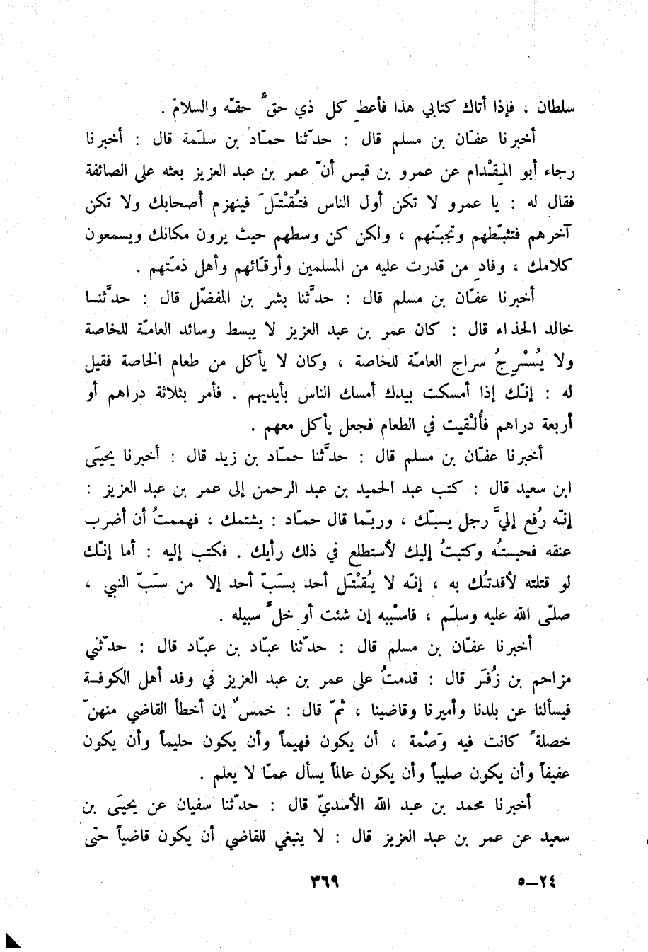 أَخْبَرَنَا عَفَّانُ بْنُ مُسْلِمٍ قَالَ: حَدَّثَنَا حَمَّادُ بْنُ زَيْدٍ قَالَ: أَخْبَرَنَا يَحْيَى بْنُ سَعِيدٍ قَالَ: كَتَبَ عَبْدُ الْحَمِيدِ بْنُ عَبْدِ الرَّحْمَنِ إِلَى عُمَرَ بْنِ عَبْدِ الْعَزِيزِ إِنَّهُ رَفَعَ إِلَيَّ رَجُلٌ يَسِبُّكَ , وَرُبَّمَا قَالَ حَمَّادٌ يَشْتُمُكَ , فَهَمَمْتُ أَنْ أَضْرِبَ عُنُقَهُ فَحَبَسْتُهُ , وَكَتَبْتُ إِلَيْكَ لِأَسْتَطْلِعَ فِي ذَلِكَ رَأْيَكَ , فَكَتَبَ إِلَيْهِ: أَمَا إِنَّكَ لَوْ قَتَلْتَهُ لَأَقَدْتَكَ بِهِ؛ إِنَّهُ §لَا يُقْتَلُ أَحَدٌ بِسَبِّ أَحَدٍ إِلَّا مَنْ سَبَّ النَّبِيَّ صلّى الله عليه وسلم , فَاسْبُبْهُ إِنْ شِئْتَ أَوْ خَلِّ سَبِيلَهُ "
