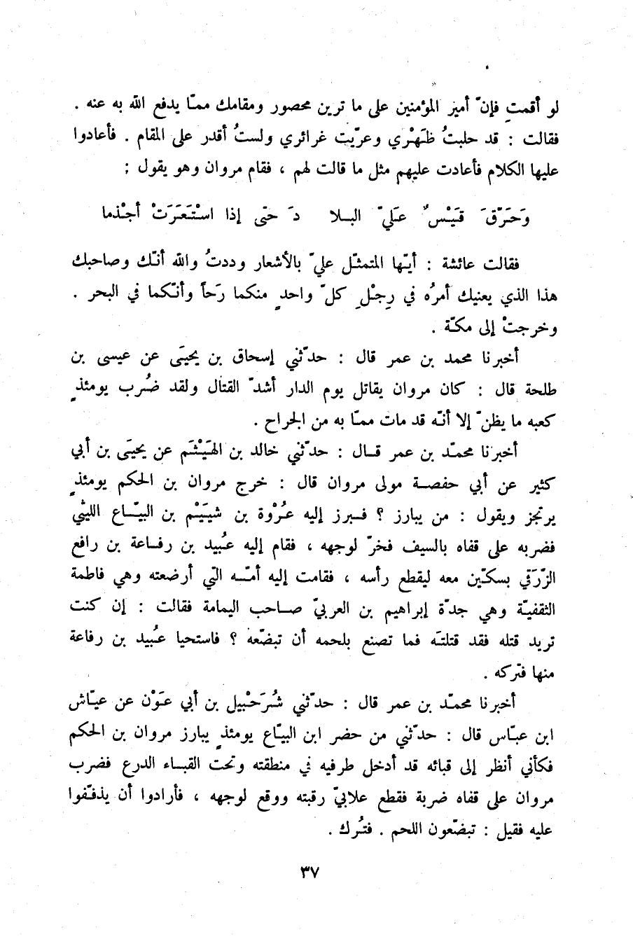 فَقَالَتْ عَائِشَةُ: أَيُّهَا الْمُتَمَثِّلُ عَلَيَّ بِالْأَشْعَارِ , وَدِدْتُ وَاللَّهِ أَنَّكَ وَصَاحِبُكَ هَذَا الَّذِي يَعْنِيكَ أَمَرُهُ فِي رِجْلِ كُلِّ وَاحِدٍ مِنْكُمَا رَحَا , وَأَنَّكُمَا فِي الْبَحْرِ , وَخَرَجَتْ إِلَى مَكَّةَ أَخْبَرَنَا مُحَمَّدُ بْنُ عُمَرَ , قَالَ: حَدَّثَنِي إِسْحَاقُ بْنُ يَحْيَى , عَنْ عِيسَى بْنِ طَلْحَةَ , قَالَ: كَانَ مَرْوَانُ يُقَاتِلُ يَوْمَ الدَّارِ أَشَدَّ الْقِتَالِ , وَلَقَدْ ضُرِبَ يَوْمَئِذٍ كَعْبُهُ مَا يُظَنُّ إِلَّا أَنَّهُ قَدْ مَاتَ مِمَّا بِهِ مِنَ الْجَرَّاحِ " أَخْبَرَنَا مُحَمَّدُ بْنُ عُمَرَ , قَالَ: حَدَّثَنِي خَالِدُ بْنُ الْهَيْثَمِ , عَنْ يَحْيَى بْنِ أَبِي كَثِيرٍ , عَنْ أَبِي حَفْصَةَ , مَوْلَى مَرْوَانَ قَالَ: خَرَجَ مَرْوَانُ بْنُ الْحَكَمِ يَوْمَئِذٍ يَرْتَجِزُ وَيَقُولُ مَنْ يُبَارِزُ؟ فَبَرَزَ إِلَيْهِ عُرْوَةُ بْنُ شِيَيْمِ بْنِ الْبَيَّاعِ اللَّيْثِيُّ , فَضَرَبَهُ عَلَى قَفَاهُ بِالسَّيْفِ فَخَرَّ لِوَجْهِهِ , فَقَامَ إِلَيْهِ عُبَيْدُ بْنُ رِفَاعَةَ بْنِ رَافِعٍ الزُّرَقِيُّ بِسِكِّينٍ مَعَهُ لِيَقْطَعَ رَأْسَهُ , فَقَامَتْ إِلَيْهِ أُمُّهُ الَّتِي أَرْضَعَتْهُ وَهِيَ فَاطِمَةُ الثَّقَفِيَّةُ وَهِيَ جَدَّةُ إِبْرَاهِيمَ بْنِ الْعَرَبِيِّ صَاحِبِ الْيَمَامَةِ , فَقَالَتْ: إِنْ كُنْتَ تُرِيدُ قَتْلَهُ فَقَدْ قَتَلْتَهُ فَمَا تَصْنَعُ بِلَحْمِهِ أَنْ تُبَضِّعَهُ فَاسْتَحْيَا عُبَيْدُ بْنُ رِفَاعَةَ مِنْهَا فَتَرَكَهُ "