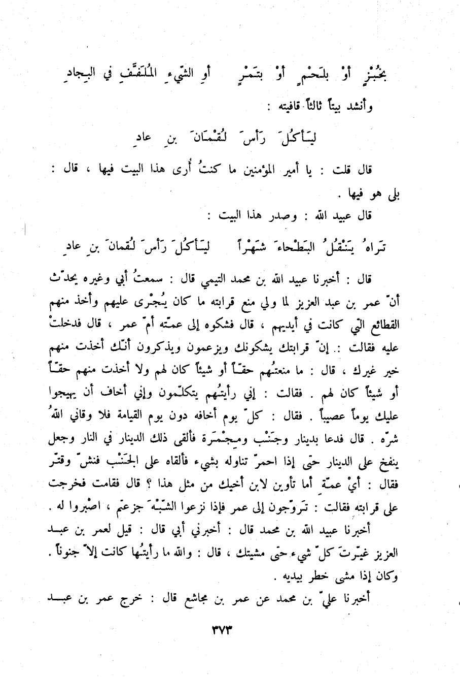 قَالَ أَخْبَرَنَا عُبَيْدُ اللَّهِ بْنُ مُحَمَّدٍ التَّيْمِيُّ قَالَ: سَمِعْتُ أَبِي وَغَيْرَهُ يُحَدِّثُ " أَنَّ عُمَرَ بْنَ عَبْدِ الْعَزِيزِ لَمَّا وَلِيَ مَنَعَ قَرَابَتَهُ مَا كَانَ يَجْرِي عَلَيْهِمْ , وَأَخَذَ مِنْهُمُ الْقَطَائِعَ الَّتِي كَانَتْ فِي أَيْدِيهِمْ. قَالَ: فَشَكَوْهُ إِلَى عَمَّتِهِ أُمِّ عُمَرَ. قَالَ: فَدَخَلَتْ عَلَيْهِ , فَقَالَتْ: إِنَّ قَرَابَتَكَ يَشْكُونَكَ وَيَزْعُمُونَ وَيَذْكُرُونَ أَنَّكَ أَخَذْتَ مِنْهُمْ خَيْرَ غَيْرِكَ. قَالَ: §مَا مَنَعْتُهُمْ حَقًّا أَوْ شَيْئًا كَانَ لَهُمْ , وَلَا أَخَذْتُ مِنْهُمْ حَقًّا أَوْ شَيْئًا كَانَ لَهُمْ , فَقَالَتْ: إِنِّي رَأَيْتُهُمْ يَتَكَلَّمُونَ , وَإِنِّي أَخَافُ أَنْ يُهَيِّجُوا عَلَيْكَ يَوْمًا عَصِيبًا , فَقَالَ: كُلَّ يَوْمٍ أَخَافَهُ دُونَ يَوْمِ الْقِيَامَةِ فَلَا وَقَانِي اللَّهُ شَرَّهُ. قَالَ: فَدَعَا بِدِينَارٍ وَجَنْبٍ وَمِجْمَرَةٍ فَأَلْقَى ذَلِكَ الدِّينَارَ فِي النَّارِ وَجَعَلَ يَنْفُخُ عَلَى الدِّينَارِ حَتَّى إِذَا احْمَرَّ تَنَاوَلَهُ بِشَيْءٍ , فَأَلْقَاهُ عَلَى الْجَنْبِ , فَنَشَّ وَقَتَرَ , فَقَالَ: أَيْ عَمَّةِ , أَمَا تَأْوِينَ لِابْنِ أَخِيكَ مِنْ مِثْلِ هَذَا؟ قَالَ: فَقَامَتْ , فَخَرَجَتْ عَلَى قَرَابَتِهِ , فَقَالَتْ: تُرَوِّجُونَ إِلَى عُمَرَ , فَإِذَا نَزَعُوا الشِّبْهَ جَزَعْتُمُ. اصْبِرُوا لَهُ "
