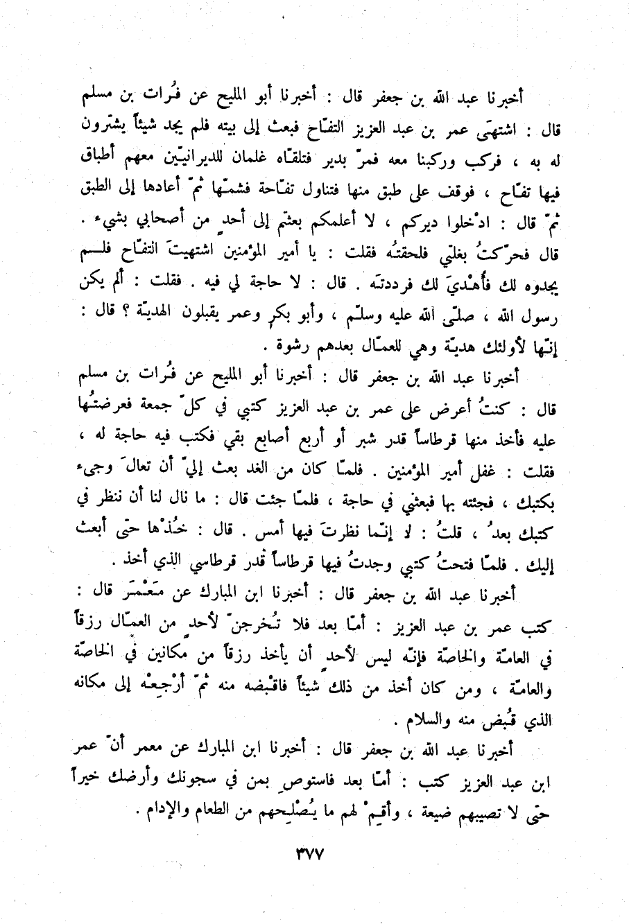 أَخْبَرَنَا عَبْدُ اللَّهِ بْنُ جَعْفَرٍ قَالَ: أَخْبَرَنَا أَبُو الْمَلِيحِ , عَنْ فُرَاتِ بْنِ سَلْمَانَ قَالَ: §اشْتَهَى عُمَرُ بْنُ عَبْدِ الْعَزِيزِ التُّفَّاحَ , فَبَعَثَ إِلَى بَيْتِهِ , فَلَمْ يَجِدْ شَيْئًا يَشْتَرُونَ لَهُ بِهِ , فَرَكِبَ , وَرَكِبْنَا مَعَهُ , فَمَرَّ بِدَيْرٍ , فَتَلَقَّاهُ غِلْمَانٌ لِلدَّيْرَانِيِّينَ مَعَهُمْ أَطْبَاقٌ فِيهَا تُفَّاحٌ , فَوَقَفَ عَلَى طَبَقٍ مِنْهَا , فَتَنَاوَلَ تُفَّاحَةً فَشَمَّهَا , ثُمَّ أَعَادَهَا إِلَى الطَّبَقِ , ثُمَّ قَالَ: ادْخُلُوا دَيْرَكُمْ. لَا أَعْلَمُكُمُ بُعِثْتُمْ إِلَى أَحَدٍ مِنْ أَصْحَابِي بِشَيْءٍ. قَالَ: فَحَرَّكْتُ بَغْلَتِي , فَلَحِقْتُهُ , فَقُلْتُ: يَا أَمِيرَ الْمُؤْمِنِينَ , اشْتَهَيْتَ التُّفَّاحَ فَلَمْ يَجِدُوهُ لَكَ , فَأُهْدِيَ لَكَ فَرَدَدْتَهُ قَالَ: لَا حَاجَةَ لِي فِيهِ , فَقُلْتُ: أَلَمْ يَكُنْ رَسُولُ اللَّهِ صلّى الله عليه وسلم وَأَبُو بَكْرٍ وَعُمَرُ يَقْبَلُونَ الْهَدِيَّةَ؟ قَالَ: إِنَّهَا لِأُولَئِكَ هَدِيَّةٌ وَهِيَ لِلْعُمَّالِ بَعْدَهُمْ رِشْوَةٌ "