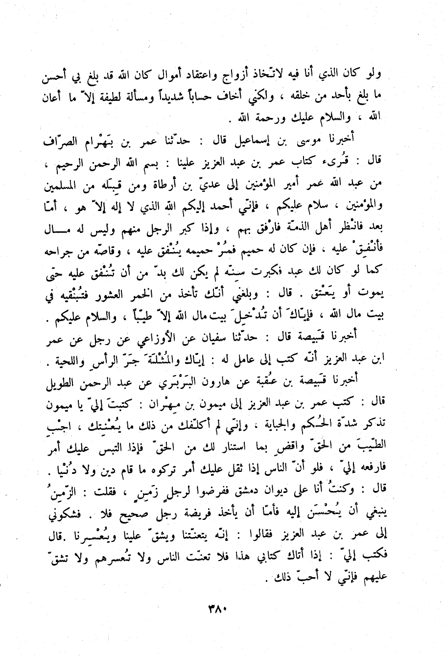أَخْبَرَنَا مُوسَى بْنُ إِسْمَاعِيلَ قَالَ: حَدَّثَنَا عُمَرُ بْنُ بَهْرَامَ الصَّرَّافُ قَالَ: قُرِئَ كِتَابُ عُمَرَ بْنِ عَبْدِ الْعَزِيزِ عَلَيْنَا: بِسْمِ اللَّهِ الرَّحْمَنِ الرَّحِيمِ. §مِنْ عَبْدِ اللَّهِ عُمَرَ أَمِيرِ الْمُؤْمِنِينَ إِلَى عَدِيِّ بْنِ أَرْطَاةَ وَمَنْ قِبَلَهُ مِنَ الْمُسْلِمِينَ وَالْمُؤْمِنِينَ سَلَامٌ عَلَيْكُمْ , فَإِنِّي أَحْمَدُ إِلَيْكُمُ اللَّهَ الَّذِي لَا إِلَهَ إِلَّا هُوَ أَمَّا بَعْدُ , فَانْظُرْ أَهْلَ الذِّمَّةِ فَارْفُقْ بِهِمْ , وَإِذَا كَبِرَ الرَّجُلُ مِنْهُمْ وَلَيْسَ لَهُ مَالٌ فَأَنْفِقْ عَلَيْهِ فَإِنْ كَانَ لَهُ حَمِيمٌ فَمُرْ حَمِيمَهُ يُنْفِقُ عَلَيْهِ , وَقَاصِّهِ مِنْ جِرَاحِهِ كَمَا لَوْ كَانَ لَكَ عَبْدٌ فَكَبِرَتْ سِنُّهُ لَمْ يَكُنْ لَكَ بُدٌّ مِنْ أَنْ تُنْفِقَ عَلَيْهِ حَتَّى يَمُوتَ أَوْ يُعْتَقَ. قَالَ: وَبَلَغَنِي أَنَّكَ تَأْخُذُ مِنَ الْخَمْرِ الْعُشُورَ فَتُبْقِيهِ فِي بَيْتِ مَالِ اللَّهِ , فَإِيَّاكَ أَنْ تُدْخِلَ بَيْتَ مَالِ اللَّهِ إِلَّا طَيِّبًا , وَالسَّلَامُ عَلَيْكُمْ "
