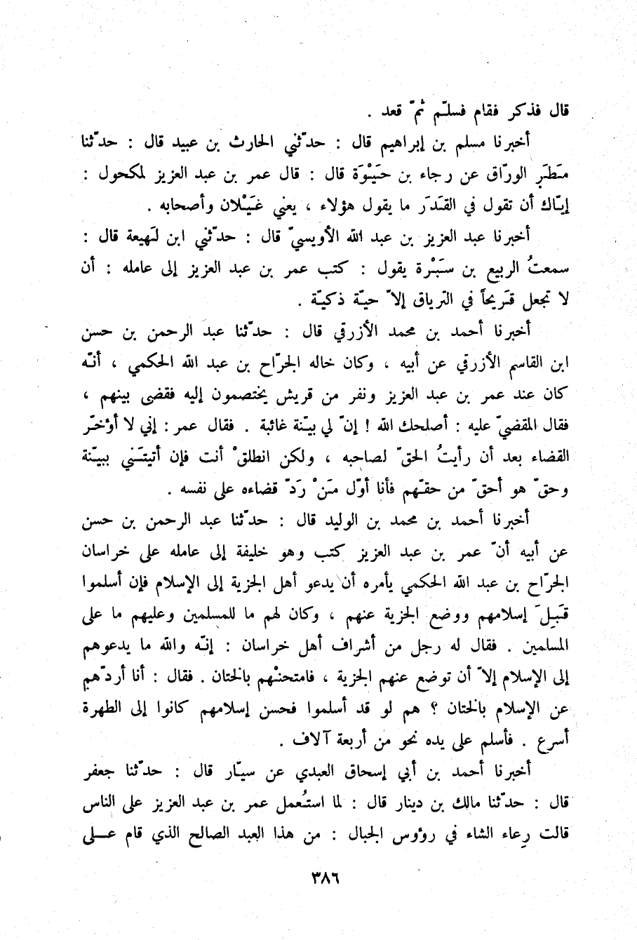 أَخْبَرَنَا أَحْمَدُ بْنُ مُحَمَّدٍ الْأَزْرَقِيُّ قَالَ: حَدَّثَنَا عَبْدُ الرَّحْمَنِ بْنُ حَسَنِ بْنِ الْقَاسِمِ الْأَزْرَقِيُّ , عَنْ أَبِيهِ , وَكَانَ خَالَهُ الْجَرَّاحُ بْنُ عَبْدِ اللَّهِ الْحَكَمِيُّ أَنَّهُ كَانَ عِنْدَ عُمَرَ بْنِ عَبْدِ الْعَزِيزِ وَنَفَرٌ مِنْ قُرَيْشٍ يَخْتَصِمُونَ إِلَيْهِ فَقَضَى بَيْنَهُمْ , فَقَالَ الْمَقْضِيُّ عَلَيْهِ: أَصْلَحَكَ اللَّهُ إِنَّ لِي بَيِّنَةً غَائِبَةً , فَقَالَ عُمَرُ: §إِنِّي لَا أُؤَخِّرُ الْقَضَاءَ بَعْدَ أَنْ رَأَيْتُ الْحَقَّ لِصَاحِبِهِ , وَلَكِنِ انْطَلِقْ أَنْتَ فَإِنْ أَتَيْتَنِي بِبَيِّنَةٍ وَحَقٍّ هُوَ أَحَقُّ مِنْ حَقِّهِمْ فَأَنَا أَوَّلُ مَنْ رَدَّ قَضَاءَهُ عَلَى نَفْسِهِ "