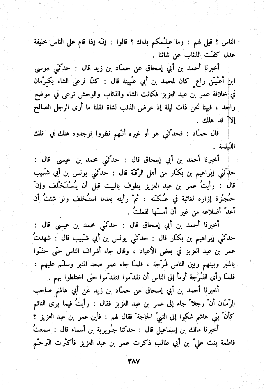 أَخْبَرَنَا أَحْمَدُ بْنُ أَبِي إِسْحَاقَ , عَنْ حَمَّادِ بْنِ زَيْدٍ قَالَ: حَدَّثَنِي مُوسَى بْنُ أَعْيَنَ رَاعٍ كَانَ لِمُحَمَّدِ بْنِ أَبِي عُيَيْنَةَ قَالَ: §كُنَّا نَرْعَى الشَّاءَ بِكِرْمَانَ فِي خِلَافَةِ عُمَرَ بْنِ عَبْدِ الْعَزِيزِ , فَكَانَتِ الشَّاءُ وَالذِّئَابُ وَالْوَحْشُ تَرْعَى فِي مَوْضِعٍ وَاحِدٍ فَبَيْنَا نَحْنُ ذَاتَ لَيْلَةٍ إِذْ عَرَضَ الذِّئْبُ لِشَاةٍ , فَقُلْنَا: مَا أَرَى الرَّجُلَ الصَّالِحَ إِلَّا قَدْ هَلَكَ. قَالَ حَمَّادٌ: فَحَدَّثَنِي هُوَ أَوْ غَيْرُهُ أَنَّهُمْ نَظَرُوا فَوَجَدُوهُ هَلَكَ فِي تِلْكَ اللَّيْلَةِ "