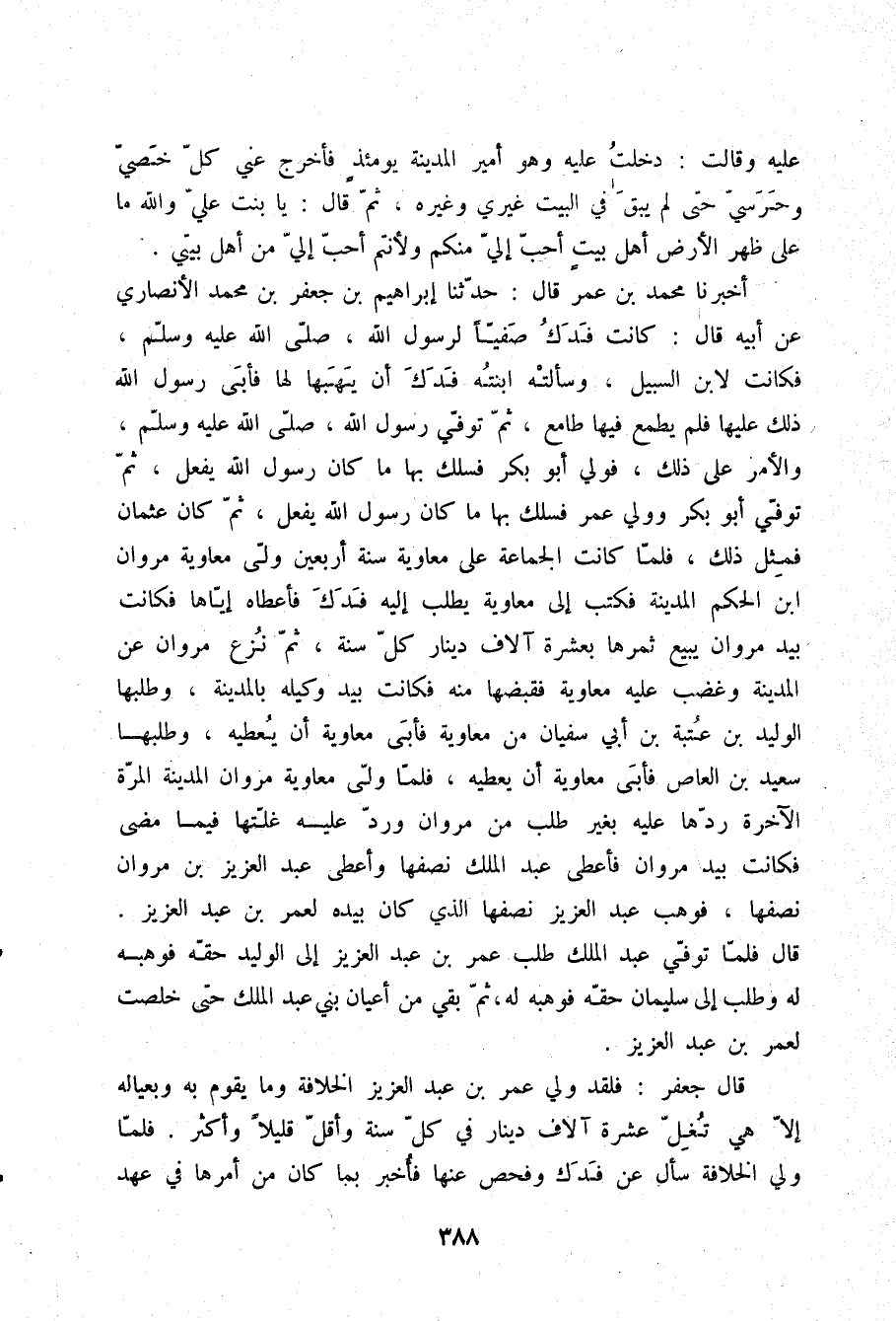 أَخْبَرَنَا مُحَمَّدُ بْنُ عُمَرَ قَالَ: حَدَّثَنَا إِبْرَاهِيمُ بْنُ جَعْفَرِ بْنِ مُحَمَّدٍ الْأَنْصَارِيُّ , عَنْ أَبِيهِ قَالَ: §كَانَتْ فَدَكُ صَفِيًّا لِرَسُولِ اللَّهِ صلّى الله عليه وسلم , فَكَانَتْ لِابْنِ السَّبِيلِ وَسَأَلَتْهُ ابْنَتُهُ فَدَكَ أَنْ يَهَبَهَا لَهَا , فَأَبَى رَسُولُ اللَّهِ ذَلِكَ عَلَيْهَا , فَلَمْ يَطْمَعْ فِيهَا طَامِعٌ , ثُمَّ تُوُفِّيَ رَسُولُ اللَّهِ صلّى الله عليه وسلم , وَالْأَمْرُ عَلَى ذَلِكَ فَوَلِيَ أَبُو بَكْرٍ , فَسَلَكَ بِهَا مَا كَانَ رَسُولُ اللَّهِ يَفْعَلُ , ثُمَّ تُوُفِّيَ أَبُو بَكْرٍ وَوَلِيَ عُمَرُ , فَسَلَكَ بِهَا مَا كَانَ رَسُولُ اللَّهِ يَفْعَلُ , ثُمَّ كَانَ عُثْمَانُ فَمِثْلُ ذَلِكَ , فَلَمَّا كَانَتِ الْجَمَاعَةُ عَلَى مُعَاوِيَةَ سَنَةَ أَرْبَعِينَ وَلَّى مُعَاوِيَةُ مَرْوَانَ بْنَ الْحَكَمِ الْمَدِينَةَ , فَكَتَبَ إِلَى مُعَاوِيَةَ يَطْلُبُ إِلَيْهِ فَدَكَ , فَأَعْطَاهُ إِيَّاهَا , فَكَانَتْ بِيَدِ مَرْوَانَ يَبِيعُ ثَمَرَهَا بِعَشَرَةِ آلَافِ دِينَارٍ كُلَّ سَنَةٍ , ثُمَّ نَزَعَ مَرْوَانُ عَنِ الْمَدِينَةِ , وَغَضِبَ عَلَيْهِ مُعَاوِيَةُ , فَقَبَضَهَا مِنْهُ , فَكَانَتْ بِيَدِ وَكِيلِهِ بِالْمَدِينَةِ , وَطَلَبَهَا الْوَلِيدُ بْنُ عُتْبَةَ بْنِ أَبِي سُفْيَانَ مِنْ مُعَاوِيَةَ فَأَبَى مُعَاوِيَةُ أَنْ يُعْطِيَهُ , وَطَلَبَهَا سَعِيدُ بْنُ الْعَاصِ فَأَبَى مُعَاوِيَةُ أَنْ يُعْطِيَهُ , فَلَمَّا وَلَّى مُعَاوِيَةُ مَرْوَانَ الْمَدِينَةَ الْمَرَّةَ الْآخِرَةَ رَدَّهَا عَلَيْهِ بِغَيْرِ طَلَبٍ مِنْ مَرْوَانَ وَرَدَّ عَلَيْهِ غَلَّتَهَا فِيمَا مَضَى , فَكَانَتْ بِيَدِ مَرْوَانَ فَأَعْطَى عَبْدَ الْمَلِكِ نِصْفَهَا وَأَعْطَى عَبْدَ الْعَزِيزِ بْنَ مَرْوَانَ نِصْفَهَا , فَوَهَبَ عَبْدُ الْعَزِيزِ نِصْفَهَا الَّذِي كَانَ بِيَدِهِ لِعُمَرَ بْنِ عَبْدِ الْعَزِيزِ. قَالَ: فَلَمَّا تُوُفِّيَ عَبْدُ الْمَلِكِ طَلَبَ عُمَرُ بْنُ عَبْدِ الْعَزِيزِ إِلَى الْوَلِيدِ حَقَّهُ فَوَهَبَهُ لَهُ , وَطَلَبَ إِلَى سُلَيْمَانَ حَقَّهُ فَوَهَبَهُ لَهُ , ثُمَّ بَقِيَ مِنْ أَعْيَانِ بَنِي عَبْدِ الْمَلِكِ حَتَّى خَلَصَتْ لِعُمَرَ بْنِ عَبْدِ الْعَزِيزِ " قَالَ جَعْفَرٌ: فَلَقَدْ وَلِيَ عُمَرُ بْنُ عَبْدِ الْعَزِيزِ الْخِلَافَةَ وَمَا يَقُومُ بِهِ وَبِعِيَالِهِ إِلَّا هِيَ تُغِلُّ عَشَرَةَ آلَافِ دِينَارٍ فِي كُلِّ سَنَةٍ وَأَقَلَّ قَلِيلًا وَأَكْثَرَ , فَلَمَّا وَلِيَ الْخِلَافَةَ سَأَلَ عَنْ فَدَكَ وَفَحَصَ عَنْهَا , فَأُخْبِرَ بِمَا كَانَ مِنْ أَمْرِهَا فِي عَهْدِ