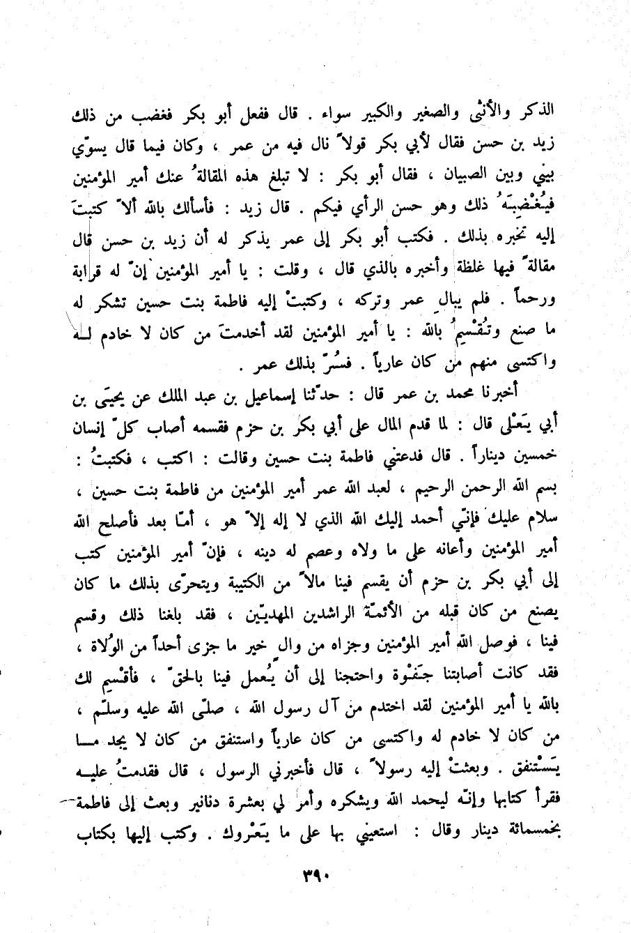 أَخْبَرَنَا مُحَمَّدُ بْنُ عُمَرَ قَالَ: حَدَّثَنَا إِسْمَاعِيلُ بْنُ عَبْدِ الْمَلِكِ , عَنْ يَحْيَى بْنِ أَبِي يَعْلَى قَالَ: لَمَّا قَدِمَ الْمَالُ عَلَى أَبِي بَكْرِ بْنِ حَزْمٍ , §فَقَسَمَهُ أَصَابَ كُلُّ إِنْسَانٍ خَمْسِينَ دِينَارًا. قَالَ: فَدَعَتْنِي فَاطِمَةُ بِنْتُ حُسَيْنٍ , وَقَالَتِ: اكْتُبْ , فَكَتَبْتُ: " بِسْمِ اللَّهِ الرَّحْمَنِ الرَّحِيمِ. لِعَبْدِ اللَّهِ , عُمَرَ أَمِيرِ الْمُؤْمِنِينَ مِنْ فَاطِمَةَ بِنْتِ حُسَيْنٍ. سَلَامٌ عَلَيْكَ , فَإِنِّي أَحْمَدُ إِلَيْكَ اللَّهَ الَّذِي لَا إِلَهَ إِلَّا هُوَ أَمَّا بَعْدُ , فَأَصْلَحَ اللَّهُ أَمِيرَ الْمُؤْمِنِينَ وَأَعَانَهُ عَلَى مَا وَلَّاهُ , وَعَصَمَ لَهُ دِينَهُ , فَإِنَّ أَمِيرَ الْمُؤْمِنِينَ كَتَبَ إِلَى أَبِي بَكْرِ بْنِ حَزْمٍ أَنْ يَقْسِمَ فِينَا مَالًا مِنَ الْكَتِيبَةِ , وَيَتَحَرَّى بِذَلِكَ مَا كَانَ يَصْنَعُ مَنْ كَانَ قَبْلَهُ مِنَ الْأَئِمَّةِ الرَّاشِدِينَ الْمَهْدِيِّينَ , فَقَدْ بَلَغَنَا ذَلِكَ , وَقَسَمَ فِينَا فَوَصَلَ اللَّهُ أَمِيرَ الْمُؤْمِنِينَ وَجَزَاهُ مِنْ وَالٍ خَيْرَ مَا جَزَى أَحَدًا مِنَ الْوُلَاةِ فَقَدْ كَانَتْ أَصَابَتْنَا جَفْوَةٌ وَاحْتَجْنَا إِلَى أَنْ يُعْمَلَ فِينَا بِالْحَقِّ , فَأُقْسِمُ بِاللَّهِ يَا أَمِيرَ الْمُؤْمِنِينَ لَقَدِ اخْتَدَمَ مِنْ آلِ رَسُولِ اللَّهِ صلّى الله عليه وسلم مَنْ كَانَ لَا خَادِمَ لَهُ , وَاكْتَسَى مَنْ كَانَ عَارِيًا , وَاسْتَنْفَقَ مَنْ كَانَ لَا يَجِدُ مَا يَسْتَنْفِقُ , وَبَعَثْتُ إِلَيْهِ رَسُولًا. قَالَ: فَأَخْبَرَنِي الرَّسُولُ قَالَ: فَقَدِمْتُ عَلَيْهِ فَقَرَأَ كِتَابَهَا وَإِنَّهُ لَيَحْمَدُ اللَّهَ وَيَشْكُرُهُ وَأَمَرَ لِي بِعَشَرَةِ دَنَانِيرَ , وَبَعَثَ إِلَى فَاطِمَةَ بِخَمْسِمِائَةِ دِينَارٍ , وَقَالَ: اسْتَعِينِي بِهَا عَلَى مَا يَعْرُوكِ , وَكَتَبَ إِلَيْهَا بِكِتَابٍ -[391]- يَذْكُرُ فَضْلَهَا وَفَضْلَ أَهْلِ بَيْتِهَا , وَيَذْكُرُ مَا أَوْجَبَ اللَّهُ لَهُمْ مِنَ الْحَقِّ. قَالَ: فَقَدِمْتُ عَلَيْهَا بِذَلِكَ الْمَالِ "
