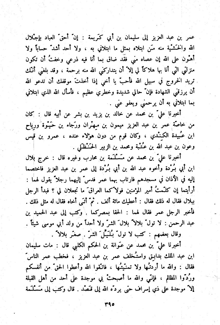 أَخْبَرَنَا عَلِيُّ بْنُ مُحَمَّدٍ , عَنْ عَوَانَةَ بْنِ الْحَكَمِ الْكَلْبِيِّ قَالَ: مَاتَ سُلَيْمَانُ بْنُ عَبْدِ الْمَلِكِ بِدَابِقٍ , وَاسْتُخْلِفَ عُمَرُ بْنُ عَبْدِ الْعَزِيزِ , فَخَطَبَ عُمَرُ النَّاسَ , فَقَالَ: وَاللَّهِ , §مَا أَرَدْتُهَا وَلَا تَمَنَّيْتُهَا , فَاتَّقُوا اللَّهَ وَأَعْطُوا الْحَقَّ مِنْ أَنْفُسِكُمْ , وَرُدُّوا الْمَظَالِمَ؛ فَإِنِّي وَاللَّهِ مَا أَصْبَحَتْ بِي مَوْجِدَةٌ عَلَى أَحَدٍ مِنْ أَهْلِ الْقِبْلَةِ إِلَّا مَوْجِدَةٌ عَلَى ذِي إِسْرَافٍ حَتَّى يَرُدَّهُ اللَّهُ إِلَى قَصْدٍ. قَالَ: وَكَتَبَ إِلَى مَسْلَمَةَ -[396]- وَهُوَ بِأَرْضِ الرُّومِ يَأْمُرُهُ بِالْقُفُولِ , وَأَرْسَلَ إِلَى النَّاسِ بِالْأَذَانِ وَالْقُفُولِ "