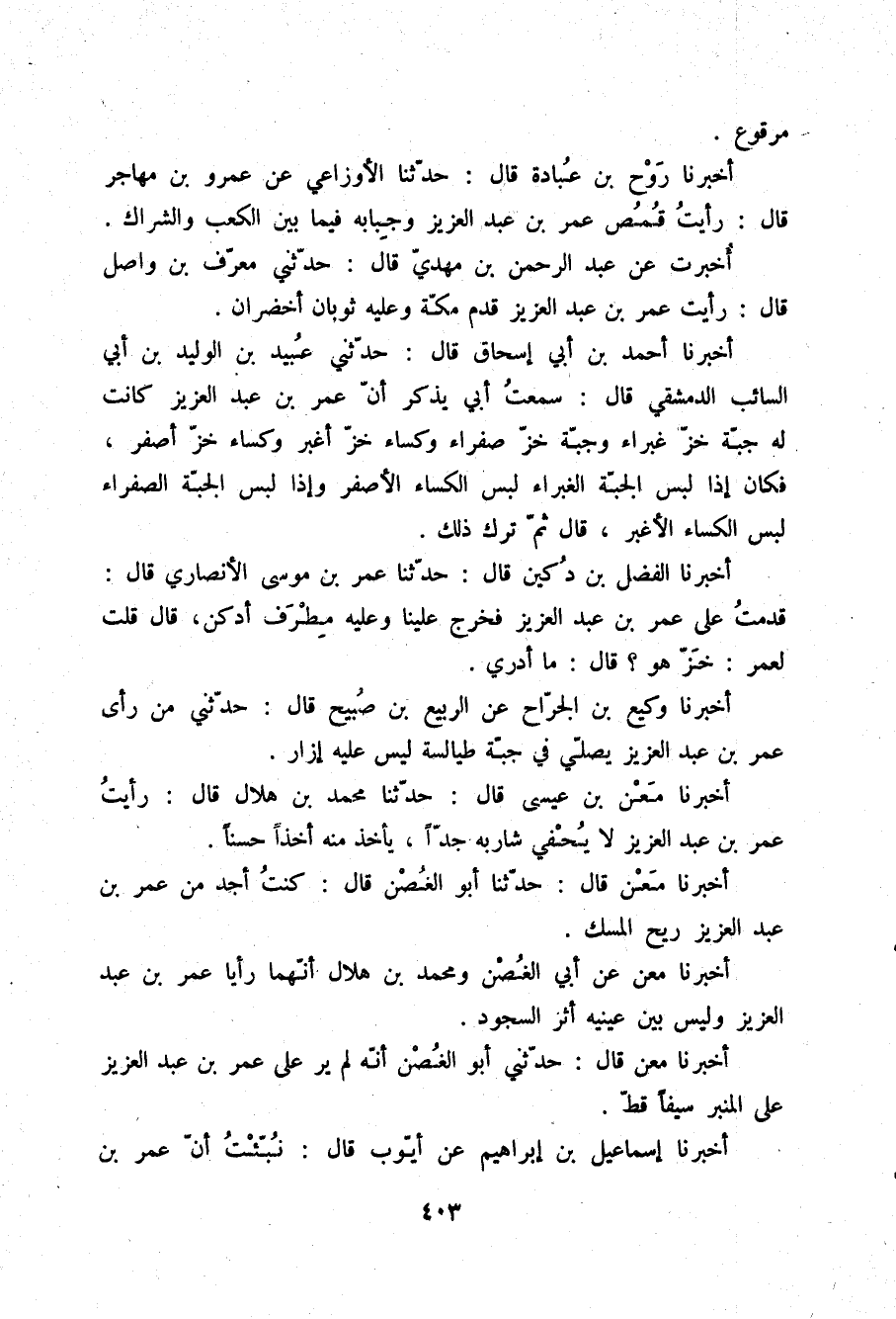 أُخْبِرْتُ عَنْ عَبْدِ الرَّحْمَنِ بْنِ مَهْدِيٍّ قَالَ: حَدَّثَنِي مُعَرِّفُ بْنُ وَاصِلٍ، قَالَ: رَأَيْتُ عُمَرَ بْنَ عَبْدِ العَزِيزِ قَدِمَ مَكَّةَ وَعَلَيْهِ ثَوْبَانَ أَخْضَرَانِ، أَخْبَرَنَا أَحْمَدُ بْنُ أَبِي إِسْحَاقَ قَالَ: حَدَّثَنِي عُبَيْدُ بْنُ الْوَلِيدِ بْنِ أَبِي السَّائِبِ الدِّمَشْقِيُّ قَالَ: سَمِعْتُ أَبِي يَذْكُرُ أَنَّ عُمَرَ بْنَ عَبْدِ الْعَزِيزِ §كَانَتْ لَهُ جُبَّةُ خَزٍّ غَبْرَاءُ وَجْبَةُ خَزٍّ صَفْرَاءُ وَكِسَاءُ خَزٍّ أَغْبَرُ وَكِسَاءُ خَزٍّ أَصْفَرُ , فَكَانَ إِذَا لَبِسَ الْجُبَّةَ الْغَبْرَاءَ لَبِسَ الْكِسَاءَ الْأَصْفَرَ , وَإِذَا لَبِسَ الْجُبَّةَ الصَّفْرَاءَ لَبِسَ الْكِسَاءَ الْأَغْبَرَ. قَالَ: ثُمَّ تَرَكَ ذَلِكَ "