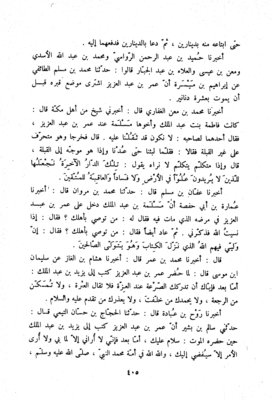 أَخْبَرَنَا حُمَيْدُ بْنُ عَبْدِ الرَّحْمَنِ الرُّوَاسِيُّ , وَمُحَمَّدُ بْنُ عَبْدِ اللَّهِ الْأَسَدِيُّ , وَمَعْنُ بْنُ عِيسَى , وَالْعَلَاءُ بْنُ عَبْدِ الْجَبَّارِ قَالُوا: حَدَّثَنَا مُحَمَّدُ بْنُ مُسْلِمٍ الطَّائِفِيُّ , عَنْ إِبْرَاهِيمَ بْنِ مَيْسَرَةَ أَنَّ عُمَرَ بْنَ عَبْدِ الْعَزِيزِ §اشْتَرَى مَوْضِعَ قَبْرِهِ قَبْلَ أَنْ يَمُوتَ بِعَشَرَةِ دَنَانِيرَ "