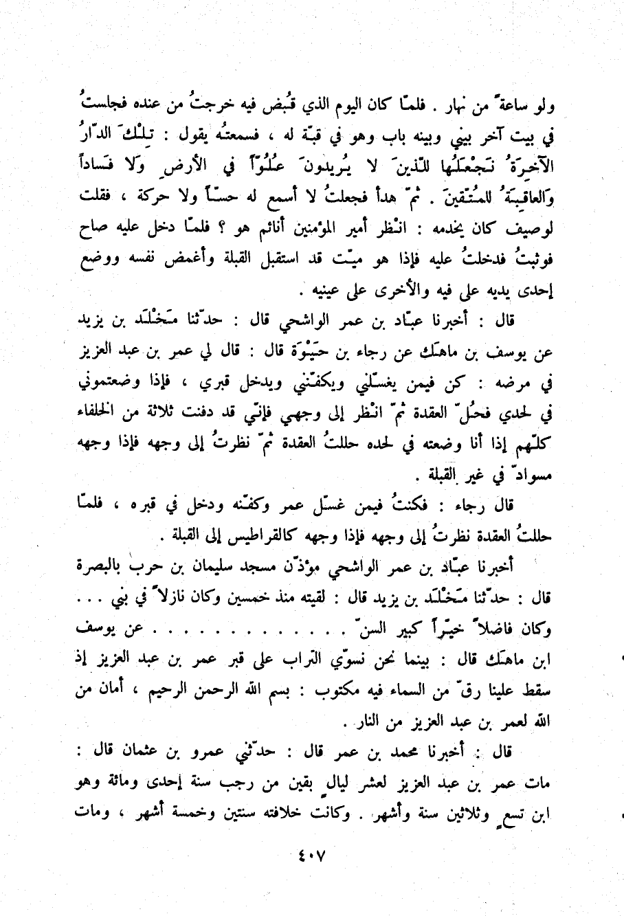قَالَ: أَخْبَرَنَا عَبَّادُ بْنُ عُمَرَ الْوَاشِحِيُّ قَالَ: حَدَّثَنَا مَخْلَدُ بْنُ يَزِيدَ , عَنْ يُوسُفَ بْنِ مَاهَكَ , عَنْ رَجَاءِ بْنِ حَيْوَةَ قَالَ: قَالَ لِي عُمَرُ بْنُ عَبْدِ الْعَزِيزِ فِي مَرَضِهِ: §كُنْ فِيمَنْ يُغَسِّلُنِي وَيُكَفَّنُنِي وَيَدْخُلُ قَبْرِي , فَإِذَا وَضَعْتُمُونِي فِي لَحْدِي فَحُلَّ الْعُقْدَةَ , ثُمَّ انْظُرْ إِلَى وَجْهِي , فَإِنِّي قَدْ دَفَنْتُ ثَلَاثَةً مِنَ الْخُلَفَاءِ كُلَّهُمْ إِذَا أَنَا وَضَعْتُهُ فِي لَحْدِهِ حَلَلْتُ الْعُقْدَةَ , ثُمَّ نَظَرْتُ إِلَى وَجْهِهِ فَإِذَا وَجْهُهُ مُسْوَادٌّ فِي غَيْرِ الْقِبْلَةِ. قَالَ رَجَاءٌ: فَكُنْتُ فِيمَنْ غَسَّلَ عُمَرَ وَكَفَّنَهُ وَدَخَلَ فِي قَبْرِهِ , فَلَمَّا حَلَلْتُ الْعُقْدَةَ نَظَرْتُ إِلَى وَجْهِهِ فَإِذَا وَجْهُهُ كَالْقَرَاطِيسِ إِلَى الْقِبْلَةِ "