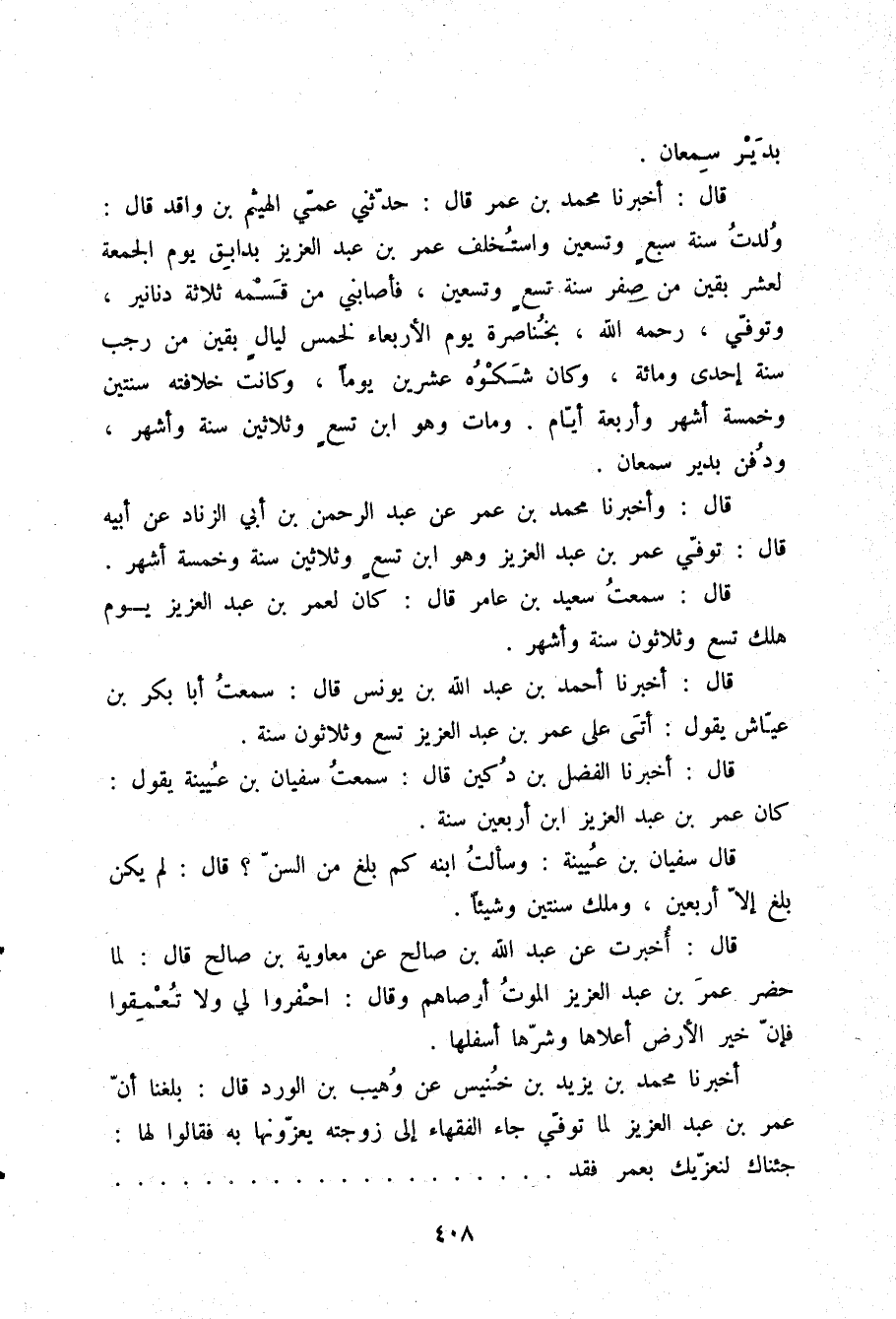قَالَ: أَخْبَرَنَا الْفَضْلُ بْنُ دُكَيْنٍ قَالَ: سَمِعْتُ سُفْيَانَ بْنَ عُيَيْنَةَ يَقُولُ: كَانَ §عُمَرُ بْنُ عَبْدِ الْعَزِيزِ ابْنَ أَرْبَعِينَ سَنَةً. قَالَ سُفْيَانُ بْنُ عُيَيْنَةَ: وَسَأَلْتُ ابْنَهُ كَمْ بَلَغَ مِنَ السِّنِّ؟ قَالَ: لَمْ يَكُنْ بَلَغَ إِلَّا أَرْبَعِينَ , وَمَلَكَ سَنَتَيْنِ وَشَيْئًا "