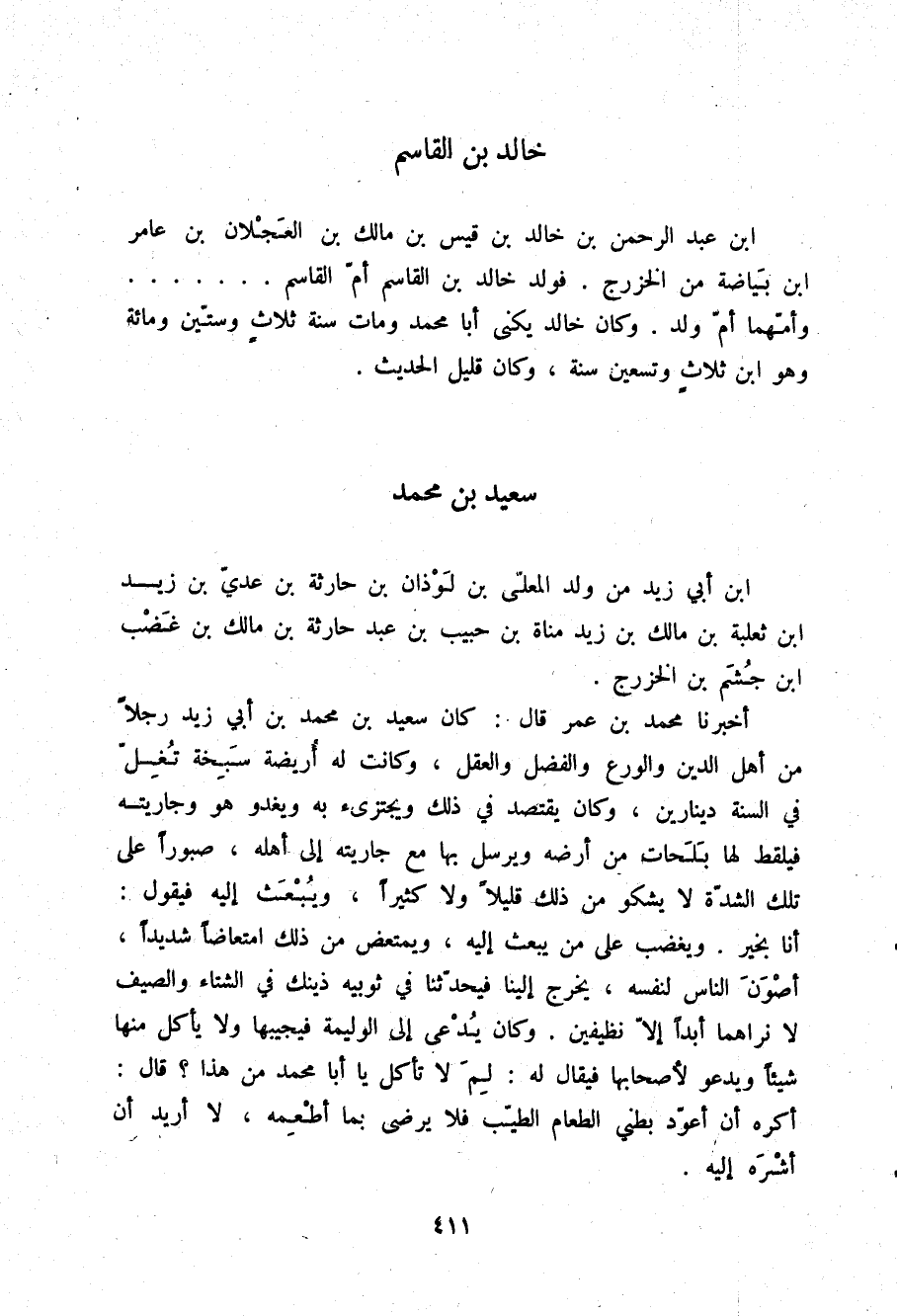§سَعِيدُ بْنُ مُحَمَّدِ بْنِ أَبِي زَيْدٍ مِنْ وَلَدِ الْمُعَلَّى بْنِ لَوْذَانَ بْنِ حَارِثَةَ بْنِ عَدِيِّ بْنِ زَيْدِ بْنِ ثَعْلَبَةَ بْنِ مَالِكِ بْنِ زَيْدِ مَنَاةَ بْنِ حَبِيبِ بْنِ عَبْدِ حَارِثَةَ بْنِ مَالِكِ بْنِ غَضْبِ بْنِ جُشَمِ بْنِ الْخَزْرَجِ أَخْبَرَنَا مُحَمَّدُ بْنُ عُمَرَ قَالَ: كَانَ سَعِيدُ بْنُ مُحَمَّدِ بْنِ أَبِي زَيْدٍ رَجُلًا مِنْ أَهْلِ الدِّينِ وَالْوَرَعِ وَالْفَضْلِ وَالْعَقْلِ , وَكَانَتْ لَهُ أَرِيضَةٌ سَبِخَةٌ تُغِلُّ فِي السَّنَةِ دِينَارَيْنِ , وَكَانَ يَقْتَصِدُ فِي ذَلِكَ , وَيَجْتَزِئُ بِهِ وَيَغْدُو هُوَ وَجَارِيَتُهُ , فَيَلْقُطُ لَهَا بَلَحَاتٍ مِنْ أَرْضِهِ وَيُرْسِلُ بِهِا مَعَ جَارِيَتِهِ إِلَى أَهْلِهِ صَبُورًا عَلَى تِلْكَ الشِّدَّةِ لَا يَشْكُو مِنْ ذَلِكَ قَلِيلًا وَلَا كَثِيرًا , وَيُبْعَثُ إِلَيْهِ , فَيَقُولُ: أَنَا بِخَيْرٍ , وَيَغْضَبُ عَلَى مَنْ يَبْعَثُ إِلَيْهِ وَيَمْتَعِضُ مِنْ ذَلِكَ امْتِعَاضًا شَدِيدًا أَصْوَنَ النَّاسِ لِنَفْسِهِ يَخْرُجُ إِلَيْنَا , فَيُحَدِّثُنَا فِي ثَوْبَيْهِ ذَيْنِكَ فِي الشِّتَاءِ وَالصَّيْفِ لَا نَرَاهُمَا أَبَدًا إِلَّا نَظِيفَيْنِ , وَكَانَ يُدْعَى إِلَى الْوَلِيمَةِ , فَيُجِيبُهَا وَلَا يَأْكُلُ مِنْهَا شَيْئًا وَيَدْعُو لِأَصْحَابِهَا , فَيُقَالُ لَهُ: لِمَ لَا تَأْكُلُ يَا أَبَا مُحَمَّدٍ مِنْ هَذَا؟ قَالَ: أَكْرَهُ أَنْ أُعَوِّدَ بَطْنِي الطَّعَامَ الطَّيِّبَ , فَلَا يَرْضَى بِمَا أَطْعَمُهُ لَا أُرِيدُ أَنْ أَشْرَهُ إِلَيْهِ