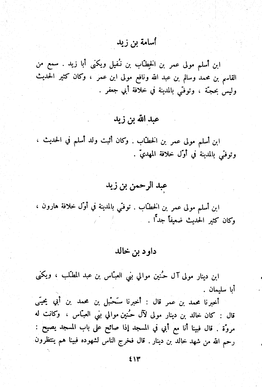 §أُسَامَةُ بْنُ زَيْدِ بْنِ أَسْلَمَ مَوْلَى عُمَرَ بْنِ الْخَطَّابِ بْنِ نُفَيْلٍ , وَيُكَنَّى أَبَا زَيْدٍ. سَمِعَ مِنَ الْقَاسِمِ بْنِ مُحَمَّدٍ , وَسَالِمِ بْنِ عَبْدِ اللَّهِ , وَنَافِعٍ مَوْلَى ابْنِ عُمَرَ , وَكَانَ كَثِيرَ الْحَدِيثِ , وَلَيْسَ بِحَجَّةٍ , وَتُوُفِّيَ بِالْمَدِينَةِ فِي خِلَافَةِ أَبِي جَعْفَرٍ