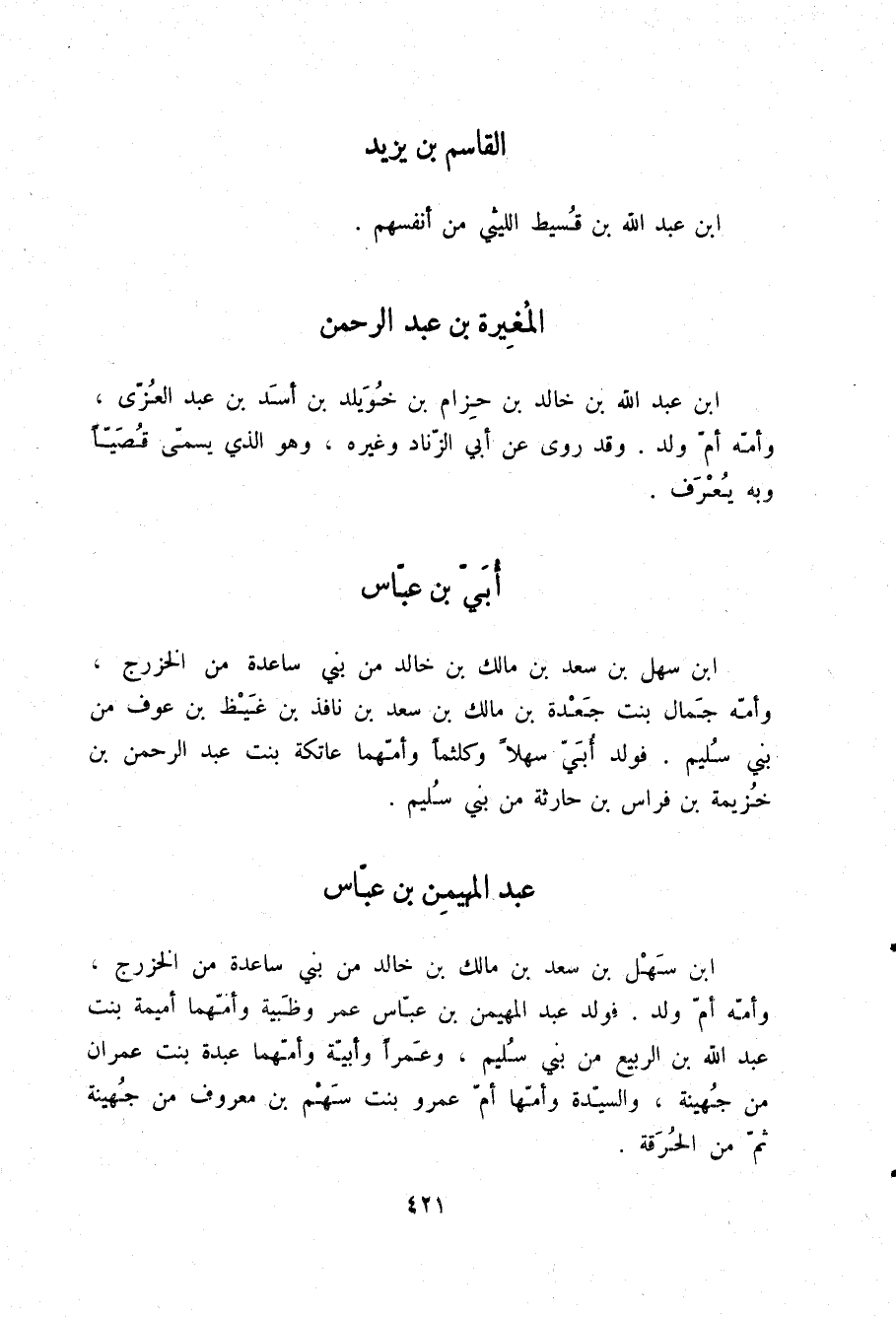 §عَبْدُ الْمُهَيْمِنِ بْنُ عَبَّاسِ بْنِ سَهْلِ بْنِ سَعْدِ بْنِ مَالِكِ بْنِ خَالِدٍ مِنْ بَنِي سَاعِدَةَ مِنَ الْخَزْرَجِ , وَأُمُّهُ أُمُّ وَلَدٍ , فَوَلَدَ عَبْدُ الْمُهَيْمِنِ بْنُ عَبَّاسٍ عُمَرَ , وَظَبْيَةَ وَأُمُّهُمَا أُمَيْمَةُ بِنْتُ عَبْدِ اللَّهِ بْنِ الرَّبِيعِ مِنْ بَنِي سُلَيْمٍ , وَعَمْرًا وَأُبَيَّةَ وَأُمُّهُمَا عَبْدَةُ بِنْتُ عِمْرَانَ مِنْ جُهَيْنَةَ , وَالسَّيِّدَةَ وَأُمُّهَا أُمُّ عَمْرٍو بِنْتُ سَهْمِ بْنِ مَعْرُوفٍ , مِنْ جُهَيْنَةَ , ثُمَّ مِنَ الْحُرَقَةِ