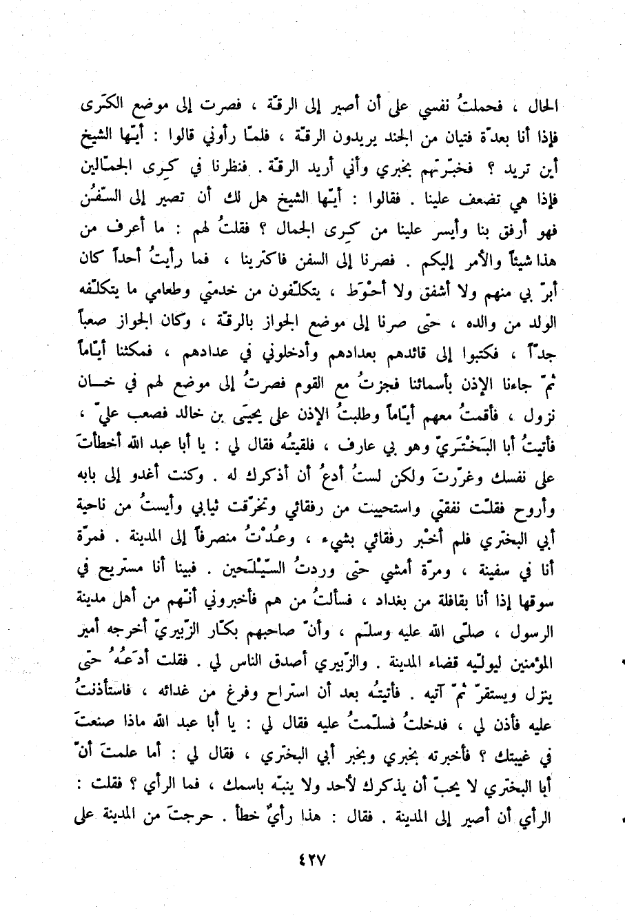الْحَالِ , فَحَمَلْتُ نَفْسِي عَلَى أَنْ أَصِيرَ إِلَى الرَّقَّةِ , فَصِرْتُ إِلَى مَوْضِعِ الْكَرَى , فَإِذَا أَنَا بِعِدَّةِ فِتْيَانٍ مِنَ الْجُنْدِ يُرِيدُونَ الرَّقَّةَ , فَلَمَّا رَأَوْنِي قَالُوا: أَيُّهَا الشَّيْخُ , أَيْنَ تُرِيدُ , فَخَبَّرْتُهُمْ بِخَبَرِي , وَأَنِّي أُرِيدُ الرَّقَّةَ , فَنَظَرْنَا فِي كِرَى الْجِمَالِ , فَإِذَا هِيَ تُضَعَّفُ عَلَيْنَا , فَقَالَوا: أَيُّهَا الشَّيْخُ , هَلْ لَكَ أَنْ تَصِيرَ إِلَى السُّفُنِ فَهُوَ أَرْفَقُ بِنَا وَأَيْسَرُ عَلَيْنَا مِنْ كِرَى الْجِمَالِ , فَقُلْتُ لَهُمْ: مَا أَعْرِفُ مِنْ هَذَا شَيْئًا وَالْأَمْرُ إِلَيْكُمْ , فَصِرْنَا إِلَى السُّفُنِ , فَاكْتَرَيْنَا , فَمَا رَأَيْتُ أَحَدًا كَانَ أَبَرَّ بِي مِنْهُمْ وَلَا أَشْفَقَ , وَلَا أَحْوَطَ يَتَكَلَّفُونَ مِنْ خِدْمَتِي وَطَعَامِي مَا يَتَكَلَّفُهُ الْوَلَدُ مِنْ وَالِدِهِ حَتَّى صِرْنَا إِلَى مَوْضِعِ الْجَوَازِ بِالرَّقَّةِ , وَكَانَ الْجَوَازُ صَعْبًا جِدًّا , فَكَتَبُوا إِلَى قَائِدِهِمْ بِعِدَادِهِمْ , وَأَدْخَلُونِي فِي عِدَادِهِمْ , فَمَكَثْنَا أَيَّامًا , ثُمَّ جَاءَنَا الْإِذْنُ بِأَسْمَائِنَا , فَجُزْتُ مَعَ الْقَوْمِ , فَصِرْتُ إِلَى مَوْضِعٍ لَهُمْ فِي خَانِ نُزُولٍ , فَأَقَمْتُ مَعَهُمْ أَيَّامًا وَطَلَبْتُ الْإِذْنَ عَلَى يَحْيَى بْنِ خَالِدٍ , فَصَعُبَ عَلَيَّ , فَأَتَيْتُ أَبَا الْبَخْتَرِيِّ وَهُوَ بِي عَارِفٌ , فَلَقِيتُهُ , فَقَالَ لِي: يَا أَبَا عَبْدِ اللَّهِ أَخْطَأْتَ عَلَى نَفْسِكَ , وَغَرَّرْتَ , وَلَكِنْ لَسْتُ أَدَعُ أَنْ أَذْكُرَكَ لَهُ , وَكُنْتُ أَغْدُو إِلَى بَابِهِ وَأَرُوحُ , فَقَلَّتْ نَفَقَتِي , وَاسْتَحْيَيْتُ مِنْ رُفَقَائِي , وَتَخَرَّقَتْ ثِيَابِي , وَأَيِسْتُ مِنْ نَاحِيَةِ أَبِي الْبَخْتَرِيِّ , فَلَمْ أُخْبِرْ رُفَقَائِي بِشَيْءٍ , وَعُدْتُ مُنْصَرِفًا إِلَى الْمَدِينَةِ فَمَرَّةً أَنَا فِي سَفِينَةٍ وَمَرَّةً أَمْشِي حَتَّى وَرَدْتُ السَّيْحَلِينَ فَبَيْنَا أَنَا مُسْتَرِيحٌ فِي سُوقِهَا إِذَا أَنَا بِقَافِلَةٍ مِنْ بَغْدَادَ , فَسَأَلْتُ: مَنْ هُمْ؟ فَأَخْبَرُونِي أَنَّهُمْ مِنْ أَهْلِ مَدِينَةِ الرَّسُولِ اللَّهِ صلّى الله عليه وسلم , وَأَنَّ صَاحِبَهُمْ بَكَّارًا الزُّبَيْرِيَّ أَخْرَجَهُ أَمِيرُ الْمُؤْمِنِينَ لِيُوَلِّيَهُ قَضَاءَ الْمَدِينَةِ , وَالزُّبَيْرِيُّ أَصْدَقُ النَّاسِ لِي , فَقُلْتُ: أَدَعُهُ حَتَّى يَنْزِلَ وَيَسْتَقِرَّ , ثُمَّ آتِيَهُ , فَأَتَيْتُهُ بَعْدَ أَنِ اسْتَرَاحَ , وَفَرَغَ مِنْ غَدَائِهِ , فَاسْتَأْذَنْتُ عَلَيْهِ , فَأَذِنَ لِي , فَدَخَلْتُ , فَسَلَّمْتُ عَلَيْهِ , فَقَالَ لِي: يَا أَبَا عَبْدِ اللَّهِ , مَاذَا صَنَعْتَ فِي غَيْبَتِكَ , فَأَخْبَرْتُهُ بِخَبَرِي وَبِخَبَرِ أَبِي الْبَخْتَرِيِّ , فَقَالَ لِي: أَمَا عَلِمْتَ أَنَّ أَبَا الْبَخْتَرِيِّ لَا يُحِبُّ أَنْ يَذْكُرَكَ لِأَحَدٍ , وَلَا يُنَبِّهَ بِاسْمِكَ , فَمَا الرَّأْيُ؟ فَقُلْتُ: الرَّأْيُ أَنْ أَصِيرَ إِلَى الْمَدِينَةِ , فَقَالَ: هَذَا رَأْيٌ خَطَأٌ. خَرَجْتَ مِنَ الْمَدِينَةِ عَلَى