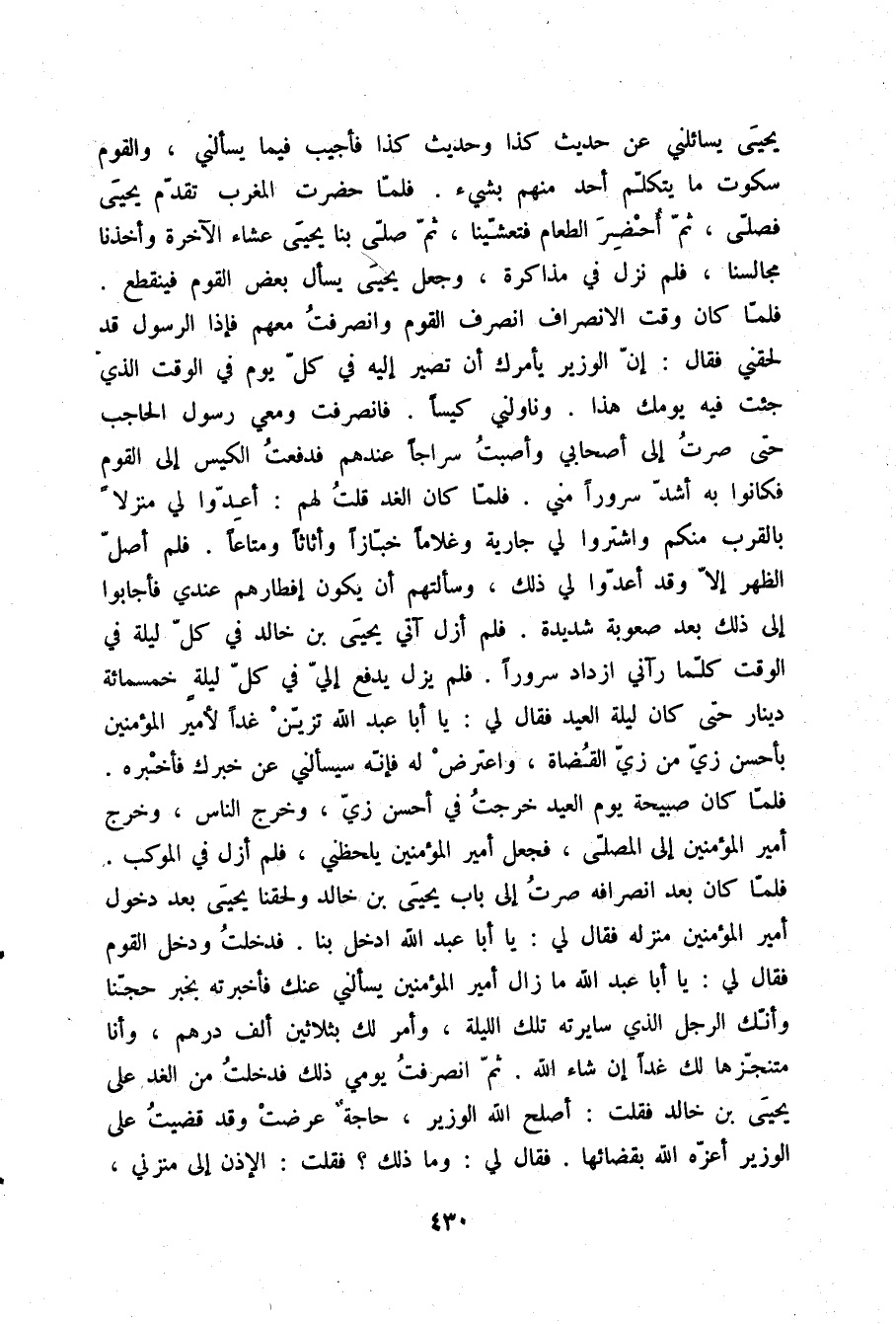 يَحْيَى يُسَائِلُنِي عَنْ حَدِيثِ كَذَا وَحَدِيثِ كَذَا فَأُجِيبُ فِيمَا يَسْأَلُنِي وَالْقَوْمُ سُكُوتٌ مَا يَتَكَلَّمُ أَحَدٌ مِنْهُمْ بِشَيْءٍ , فَلَمَّا حَضَرَتِ الْمَغْرِبُ تَقَدَّمَ يَحْيَى فَصَلَّى , ثُمَّ أَحْضَرَ الطَّعَامَ فَتَعَشَّيْنَا , ثُمَّ صَلَّى بِنَا يَحْيَى عِشَاءَ الْآخِرَةِ , وَأَخَذْنَا مَجَالِسَنَا , فَلَمْ نَزَلْ فِي مُذَاكَرَةٍ , وَجَعَلَ يَحْيَى يَسْأَلُ بَعْضَ الْقَوْمِ فَيَنْقَطِعُ , فَلَمَّا كَانَ وَقْتُ الِانْصِرَافِ انْصَرَفَ الْقَوْمُ وَانْصَرَفْتُ مَعَهُمْ , فَإِذَا الرَّسُولُ قَدْ لَحِقَنِي , فَقَالَ: إِنَّ الْوَزِيرَ يَأْمُرُكَ أَنْ تَصِيرَ إِلَيْهِ فِي كُلِّ يَوْمٍ فِي الْوَقْتِ الَّذِي جِئْتَ فِيهِ يَوْمَكَ هَذَا , وَنَاوَلَنِي كِيسًا , فَانْصَرَفْتُ وَمَعِي رَسُولُ الْحَاجِبِ حَتَّى صِرْتُ إِلَى أَصْحَابِي , وَأَصَبْتُ سِرَاجًا عِنْدَهُمْ , فَدَفَعْتُ الْكِيسَ إِلَى الْقَوْمِ , فَكَانُوا بِهِ أَشَدَّ سُرُورًا مِنِّي , فَلَمَّا كَانَ الْغَدُ قُلْتُ لَهُمْ: أَعِدُّوا لِي مَنْزِلًا بِالْقُرْبِ مِنْكُمْ , وَاشْتَرُوا لِي جَارِيَةً وَغُلَامًا خَبَّازًا وَأَثَاثًا وَمَتَاعًا , فَلَمْ أُصَلِّ الظُّهْرَ إِلَّا وَقَدْ أَعَدُّوا لِي ذَلِكَ , وَسَأَلْتُهُمْ أَنْ يَكُونَ إِفْطَارُهُمْ عِنْدِي فَأَجَابُوا إِلَى ذَلِكَ بَعْدَ صُعُوبَةٍ شَدِيدَةٍ , فَلَمْ أَزَلْ آتِي يَحْيَى بْنَ خَالِدٍ فِي كُلِّ لَيْلَةٍ فِي الْوَقْتِ كُلَّمَا رَآنِي ازْدَادَ سُرُورًا , فَلَمْ يَزَلْ يَدْفَعُ إِلَيَّ فِي كُلِّ لَيْلَةٍ خَمْسَمِائَةِ دِينَارٍ حَتَّى كَانَ لَيْلَةُ الْعِيدِ , فَقَالَ لِي: يَا أَبَا عَبْدِ اللَّهِ , تَزَيَّنْ غَدًا لِأَمِيرِ الْمُؤْمِنِينَ بِأَحْسَنِ زِيٍّ مِنْ زِيِّ الْقُضَاةِ , وَاعْتَرِضْ لَهُ؛ فَإِنَّهُ سَيَسْأَلُنِي عَنْ خَبَرِكَ فَأُخْبِرُهُ , فَلَمَّا كَانَ صَبِيحَةُ يَوْمِ الْعِيدِ خَرَجْتُ فِي أَحْسَنِ زِيٍّ وَخَرَجَ النَّاسُ وَخَرَجَ أَمِيرُ الْمُؤْمِنِينَ إِلَى الْمُصَلَّى فَجَعَلَ أَمِيرُ الْمُؤْمِنِينَ يَلْحَظُنِي , فَلَمْ أَزَلْ فِي الْمَوْكِبِ , فَلَمَّا كَانَ بَعْدَ انْصِرَافِهِ صِرْتُ إِلَى بَابِ يَحْيَى بْنِ خَالِدٍ , وَلَحِقَنَا يَحْيَى بَعْدَ دُخُولِ أَمِيرِ الْمُؤْمِنِينَ مَنْزِلَهُ , فَقَالَ لِي: يَا أَبَا عَبْدِ اللَّهِ , ادْخُلْ بِنَا , فَدَخَلْتُ وَدَخَلَ الْقَوْمُ , فَقَالَ لِي: يَا أَبَا عَبْدِ اللَّهِ , مَا زَالَ أَمِيرُ الْمُؤْمِنِينَ يَسْأَلُنِي عَنْكَ فَأَخْبَرْتُهُ بِخَبَرِ حَجَّتِنَا , وَأَنَّكَ الرَّجُلُ الَّذِي سَايَرْتَهُ تِلْكَ اللَّيْلَةَ وَأَمَرَ لَكَ بِثَلَاثِينَ أَلْفِ دِرْهَمٍ , وَأَنَا مُتَنَجِّزُهَا لَكَ غَدًا إِنْ شَاءَ اللَّهُ , ثُمَّ انْصَرَفْتُ يَوْمِي ذَلِكَ , فَدَخَلْتُ مِنَ الْغَدِ عَلَى يَحْيَى بْنِ خَالِدٍ , فَقُلْتُ: أَصْلَحَ اللَّهُ الْوَزِيرَ حَاجَةٌ عَرَضَتْ وَقَدْ قَضَيْتُ عَلَى الْوَزِيرِ أَعَزَّهُ اللَّهُ بِقَضَائِهَا , فَقَالَ لِي: وَمَا ذَلِكَ؟ فَقُلْتُ: الْإِذْنُ إِلَى مَنْزِلِي؛