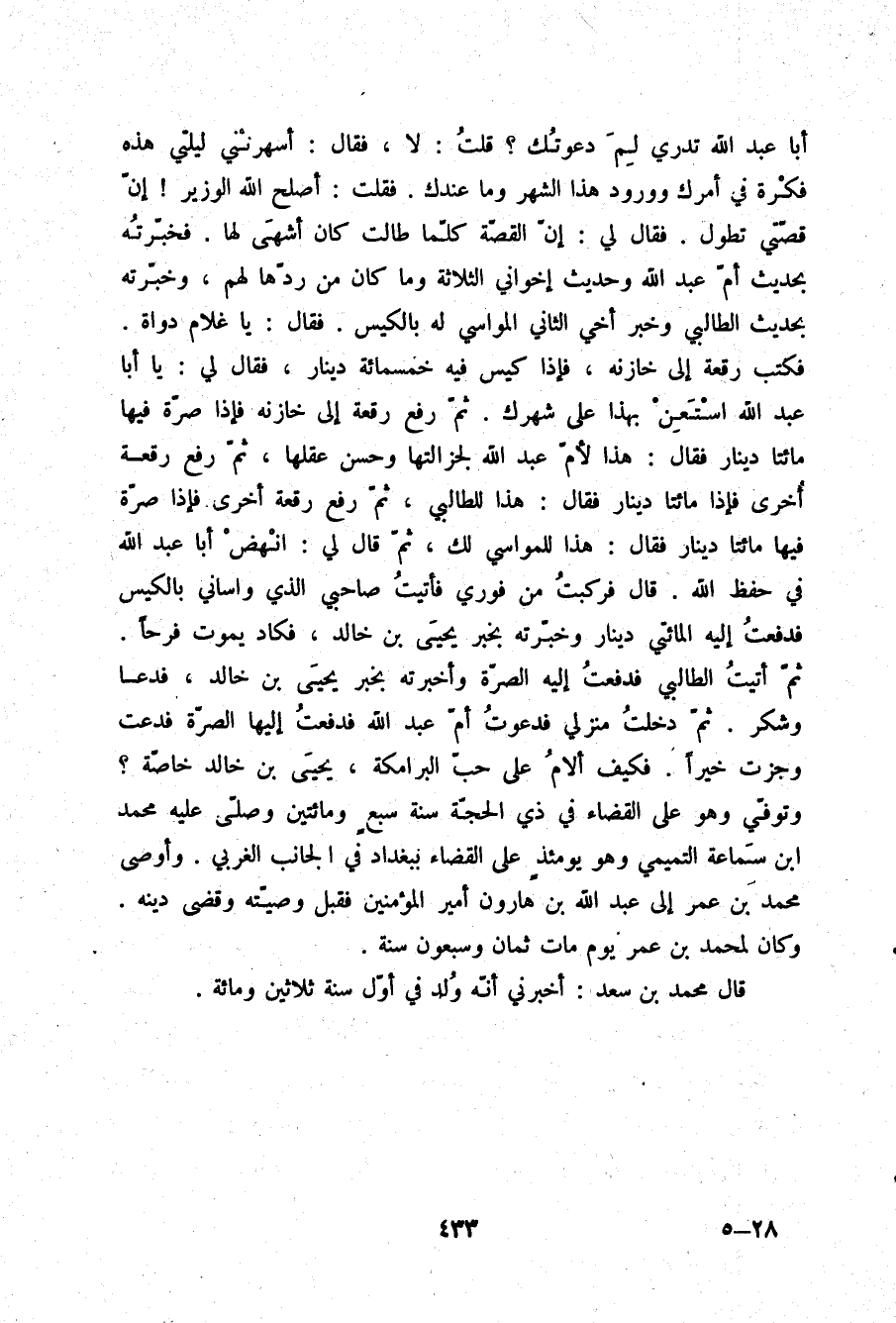: أَبَا عَبْدِ اللَّهِ تَدْرِي لِمَ دَعَوْتُكَ؟ قُلْتُ: لَا , فَقَالَ: أَسْهَرَتْنِي لَيْلَتِي هَذِهِ فِكْرَةً فِي أَمْرِكَ , وَوُرُودِ هَذَا الشَّهْرِ , وَمَا عِنْدَكَ , فَقُلْتُ: أَصْلَحَ اللَّهُ الْوَزِيرَ , إِنَّ قِصَّتِي تَطُولُ , فَقَالَ لِي: إِنَّ الْقِصَّةَ كُلَّمَا طَالَتْ كَانَ أَشْهَى لَهَا , فَخَبَّرْتُهُ بِحَدِيثِ أُمِّ عَبْدِ اللَّهِ , وَحَدِيثِ إِخْوَانِي الثَّلَاثَةِ , وَمَا كَانَ مِنْ رَدِّهَا لَهُمْ , وَخَبَّرْتُهُ بِحَدِيثِ الطَّالِبِيِّ وَخَبَرِ أَخِي الثَّانِي الْمُوَاسِي لَهُ بِالْكِيسِ فَقَالَ: يَا غُلَامُ , دَوَاةً , فَكَتَبَ رُقْعَةً إِلَى خَازِنِهِ , فَإِذَا كِيسٌ فِيهِ خَمْسُمِائَةُ دِينَارٍ , فَقَالَ لِي: يَا أَبَا عَبْدِ اللَّهِ , اسْتَعِنْ بِهَذَا عَلَى شَهْرِكَ , ثُمَّ رَفَعَ رُقْعَةً إِلَى خَازِنِهِ , فَإِذَا صُرَّةٌ فِيهَا مِائَتَا دِينَارٍ , فَقَالَ: هَذَا لِأُمِّ عَبْدِ اللَّهِ؛ لِجَزَالَتِهَا وَحُسْنِ عَقْلِهَا , ثُمَّ رَفَعَ رُقْعَةً أُخْرَى فَإِذَا مِائَتَا دِينَارٍ , فَقَالَ: هَذَا لِلطَّالِبِيِّ , ثُمَّ رَفَعَ رُقْعَةً أُخْرَى فَإِذَا صُرَّةٌ أُخْرَى فِيهَا مِائَتَا دِينَارٍ , فَقَالَ: هَذَا لِلْمُوَاسِي لَكَ , ثُمَّ قَالَ لِي: انْهَضْ أَبَا عَبْدِ اللَّهِ فِي حِفْظِ اللَّهِ. قَالَ: فَرَكِبْتُ مِنْ فَوْرِي , فَأَتَيْتُ صَاحِبِي الَّذِي وَاسَانِي بِالْكَيْسِ , فَدَفَعْتُ إِلَيْهِ الْمِائَتَيْ دِينَارٍ , وَخَبَّرْتُهُ بِخَبَرِ يَحْيَى بْنِ خَالِدٍ , فَكَادَ يَمُوتُ فَرِحًا , ثُمَّ أَتَيْتُ الطَّالِبِيَّ , فَدَفَعْتُ إِلَيْهِ الصُّرَّةَ , وَأَخْبَرْتُهُ بِخَبَرِ يَحْيَى بْنِ خَالِدٍ , فَدَعَا وَشَكَرَ , ثُمَّ دَخَلْتُ مَنْزِلِي , فَدَعَوْتُ أُمَّ عَبْدِ اللَّهِ فَدَفَعْتُ إِلَيْهَا الصُّرَّةَ , فَدَعَتْ وَجَزَتْ خَيْرًا , فَكَيْفَ أُلَامُ عَلَى حُبِّ الْبَرَامِكَةِ يَحْيَى بْنِ خَالِدٍ خَاصَّةً؟ وَتُوُفِّيَ وَهُوَ عَلَى الْقَضَاءِ فِي ذِي الْحِجَّةِ سَنَةَ سَبْعٍ وَمِائَتَيْنِ , وَصَلَّى عَلَيْهِ مُحَمَّدُ بْنُ سَمَاعَةَ التَّمِيمِيُّ وَهُوَ يَوْمَئِذٍ عَلَى الْقَضَاءِ بِبَغْدَادَ فِي الْجَانِبِ الْغَرْبِيِّ , وَأَوْصَى مُحَمَّدُ بْنُ عُمَرَ إِلَى عَبْدِ اللَّهِ بْنِ هَارُونَ أَمِيرِ الْمُؤْمِنِينَ , فَقَبِلَ وَصِيَّتَهُ , وَقَضَى دَيْنَهُ , وَكَانَ لِمُحَمَّدِ بْنِ عُمَرَ يَوْمَ مَاتَ ثَمَانٍ وَسَبْعُونَ سَنَةً. قَالَ مُحَمَّدُ بْنُ سَعْدٍ: أَخْبَرَنِي أَنَّهُ وُلِدَ فِي أَوَّلِ سَنَةِ ثَلَاثِينَ وَمِائَةٍ