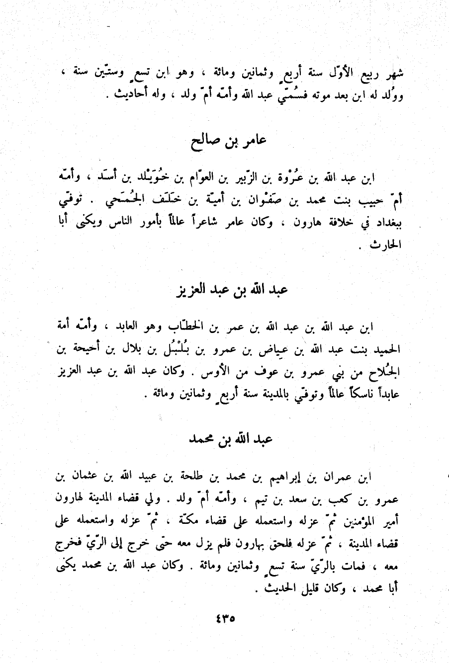 §عَبْدُ اللَّهِ بْنُ مُحَمَّدِ بْنِ عِمْرَانَ بْنِ إِبْرَاهِيمَ بْنِ مُحَمَّدِ بْنِ طَلْحَةَ بْنِ عُبَيْدِ اللَّهِ بْنِ عُثْمَانَ بْنِ عَمْرِو بْنِ كَعْبِ بْنِ سَعْدِ بْنِ تَيْمٍ وَأُمُّهُ أُمُّ وَلَدٍ. وَلِيَ قَضَاءَ الْمَدِينَةِ لِهَارُونَ أَمِيرِ الْمُؤْمِنِينَ , ثُمَّ عَزَلَهُ , وَاسْتَعْمَلَهُ عَلَى قَضَاءِ مَكَّةَ , ثُمَّ عَزَلَهُ , وَاسْتَعْمَلَهُ عَلَى قَضَاءِ الْمَدِينَةِ , ثُمَّ عَزَلَهُ فَلَحِقَ بِهِارُونَ فَلَمْ يَزَلْ مَعَهُ حَتَّى خَرَجَ إِلَى الرَّيِّ , فَخَرَجَ مَعَهُ , فَمَاتَ بِالرَّيِّ سَنَةَ تِسْعٍ وَثَمَانِينَ وَمِائَةٍ , وَكَانَ عَبْدُ اللَّهِ بْنُ مُحَمَّدٍ يُكْنَى أَبَا مُحَمَّدٍ , وَكَانَ قَلِيلَ الْحَدِيثِ
